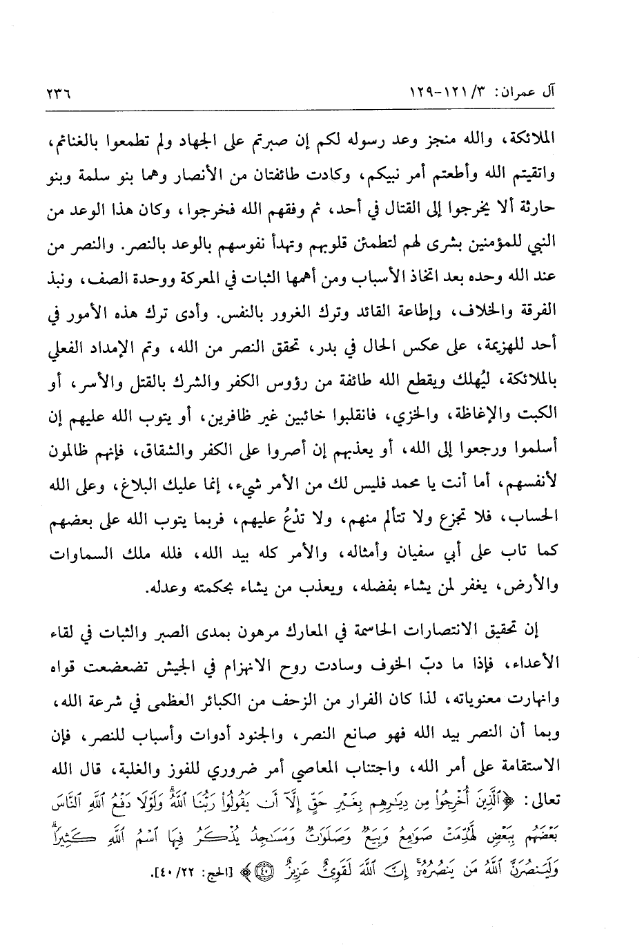 الملائكة، والله منجز وعد رسوله لكم إن صبرتم على الجهاد ولم تطمعوا بالغنائم، واتقيتم الله وأطعتم أمر نبيكم، وكادت طائفتان من الأنصار وهما بنو سلمة وبنو حارثة ألا يخرجوا إلى القتال في أحد، ثم وفقهم الله فخرجوا، وكان هذا الوعد من النبي للمؤمنين بشرى لهم لتطمئن قلوبهم وتهدأ نفوسهم بالوعد بالنصر. والنصر من عند الله وحده بعد اتخاذ الأسباب ومن أهمها الثبات في المعركة ووحدة الصف، ونبذ الفرقة والخلاف، وإطاعة القائد وترك الغرور بالنفس. وأدى ترك هذه الأمور في أحد للهزيمة، على عكس الحال في بدر، تحقق النصر من الله، وتم الإمداد الفعلي بالملائكة، ليهلك ويقطع الله طائفة من رؤوس الكفر والشرك بالقتل والأسر، أو الكبت والإغاظة، والخزي، فانقلبوا خائبين غير ظافرين، أو يتوب الله عليهم إن أسلموا ورجعوا إلى الله، أو يعذبهم إن أصروا على الكفر والشقاق، فإنهم ظالمون لأنفسهم، أما أنت يا محمد فليس لك من الأمر شيء، إنما عليك البلاغ، وعلى الله الحساب، فلا تجزع ولا تتألم منهم، ولا تدع عليهم، فربما يتوب الله على بعضهم كما تاب على أبي سفيان وأمثاله، والأمر كله بيد الله، فلله ملك السماوات والأرض، يغفر لمن يشاء بفضله، ويعذب من يشاء بحكمته وعدله.