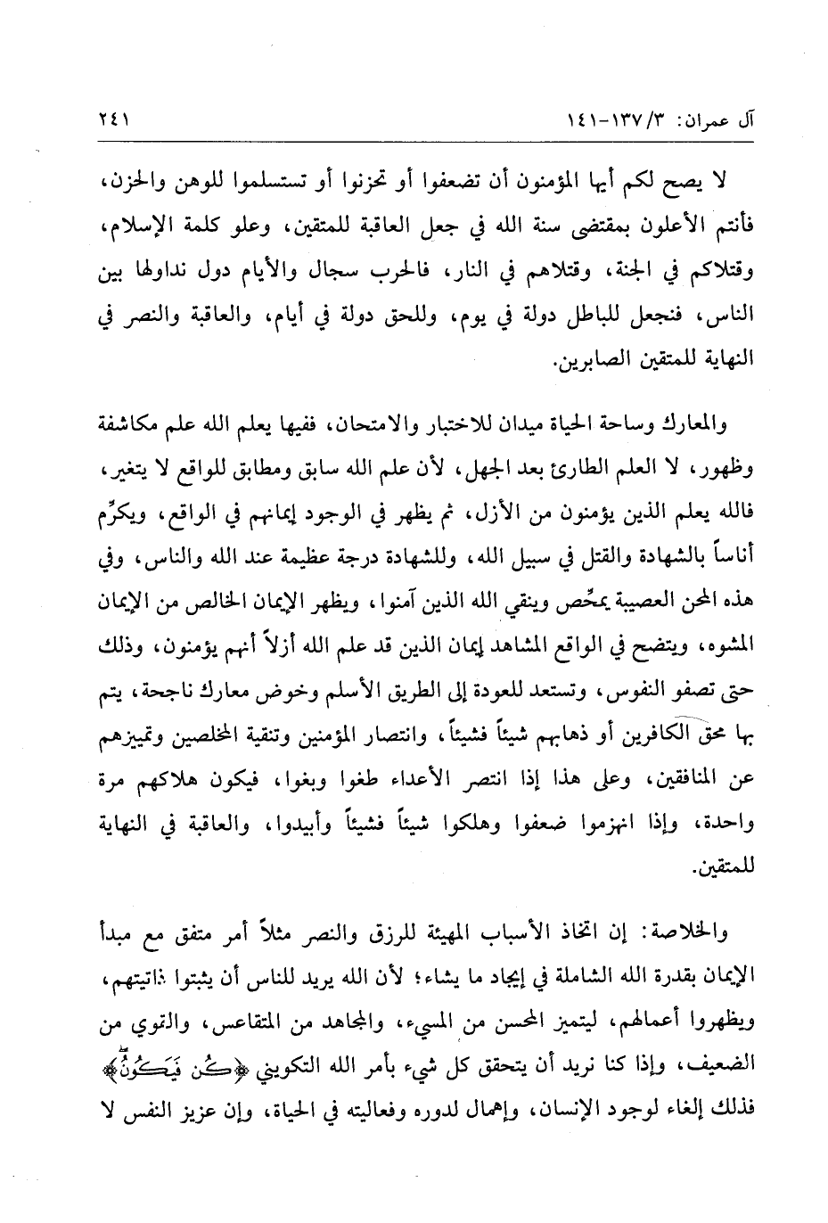 والمعارك وساحة الحياة ميدان للاختبار والامتحان، ففيها يعلم الله علم مكاشفة وظهور، لا العلم الطارئ بعد الجهل، لأن علم الله سابق ومطابق للواقع لا يتغير، فالله يعلم الذين يؤمنون من الأزل، ثم يظهر في الوجود إيمانهم في الواقع، ويكرّم أناسا بالشهادة والقتل في سبيل الله، وللشهادة درجة عظيمة عند الله والناس، وفي هذه المحن العصيبة يمحّص وينقي الله الذين آمنوا، ويظهر الإيمان الخالص من الإيمان المشوه، ويتضح في الواقع المشاهد إيمان الذين قد علم الله أزلا أنهم يؤمنون، وذلك حتى تصفو النفوس، وتستعد للعودة إلى الطريق الأسلم وخوض معارك ناجحة، يتم بها محق الكافرين أو ذهابهم شيئا فشيئا، وانتصار المؤمنين وتنقية المخلصين وتمييزهم عن المنافقين، وعلى هذا إذا انتصر الأعداء طغوا وبغوا، فيكون هلاكهم مرة واحدة، وإذا انهزموا ضعفوا وهلكوا شيئا فشيئا وأبيدوا، والعاقبة في النهاية للمتقين.