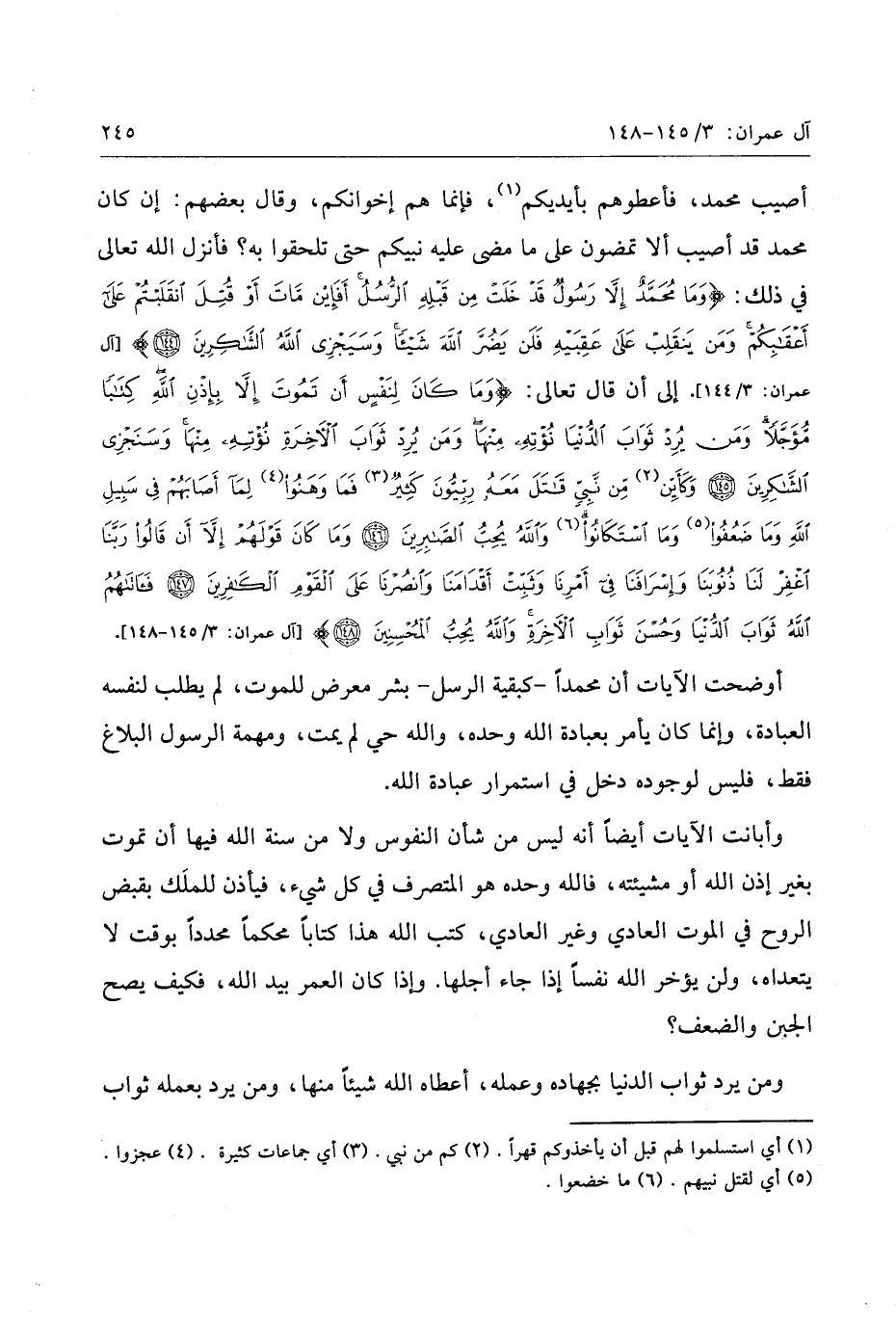 وَما كانَ لِنَفْسٍ أَنْ تَمُوتَ إِلاَّ بِإِذْنِ اللَّهِ كِتاباً مُؤَجَّلاً وَمَنْ يُرِدْ ثَوابَ الدُّنْيا نُؤْتِهِ مِنْها وَمَنْ يُرِدْ ثَوابَ الْآخِرَةِ نُؤْتِهِ مِنْها وَسَنَجْزِي الشَّاكِرِينَ (145) وَكَأَيِّنْ مِنْ نَبِيٍّ قاتَلَ مَعَهُ رِبِّيُّونَ كَثِيرٌ فَما وَهَنُوا لِما أَصابَهُمْ فِي سَبِيلِ اللَّهِ وَما ضَعُفُوا وَمَا اسْتَكانُوا وَاللَّهُ يُحِبُّ الصَّابِرِينَ (146) وَما كانَ قَوْلَهُمْ إِلاَّ أَنْ قالُوا رَبَّنَا اغْفِرْ لَنا ذُنُوبَنا وَإِسْرافَنا فِي أَمْرِنا وَثَبِّتْ أَقْدامَنا وَانْصُرْنا عَلَى الْقَوْمِ الْكافِرِينَ (147) فَآتاهُمُ اللَّهُ ثَوابَ الدُّنْيا وَحُسْنَ ثَوابِ الْآخِرَةِ وَاللَّهُ يُحِبُّ الْمُحْسِنِينَ (148)