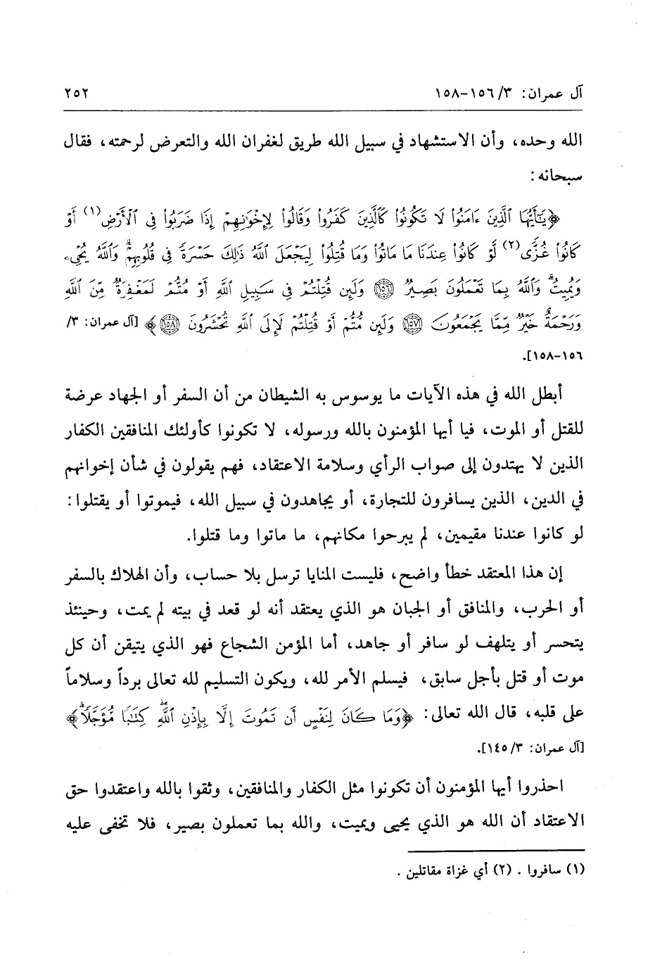 يا أَيُّهَا الَّذِينَ آمَنُوا لا تَكُونُوا كَالَّذِينَ كَفَرُوا وَقالُوا لِإِخْوانِهِمْ إِذا ضَرَبُوا فِي الْأَرْضِ أَوْ كانُوا غُزًّى لَوْ كانُوا عِنْدَنا ما ماتُوا وَما قُتِلُوا لِيَجْعَلَ اللَّهُ ذلِكَ حَسْرَةً فِي قُلُوبِهِمْ وَاللَّهُ يُحْيِي وَيُمِيتُ وَاللَّهُ بِما تَعْمَلُونَ بَصِيرٌ (156) وَلَئِنْ قُتِلْتُمْ فِي سَبِيلِ اللَّهِ أَوْ مُتُّمْ لَمَغْفِرَةٌ مِنَ اللَّهِ وَرَحْمَةٌ خَيْرٌ مِمَّا يَجْمَعُونَ (157) وَلَئِنْ مُتُّمْ أَوْ قُتِلْتُمْ لَإِلَى اللَّهِ تُحْشَرُونَ (158)