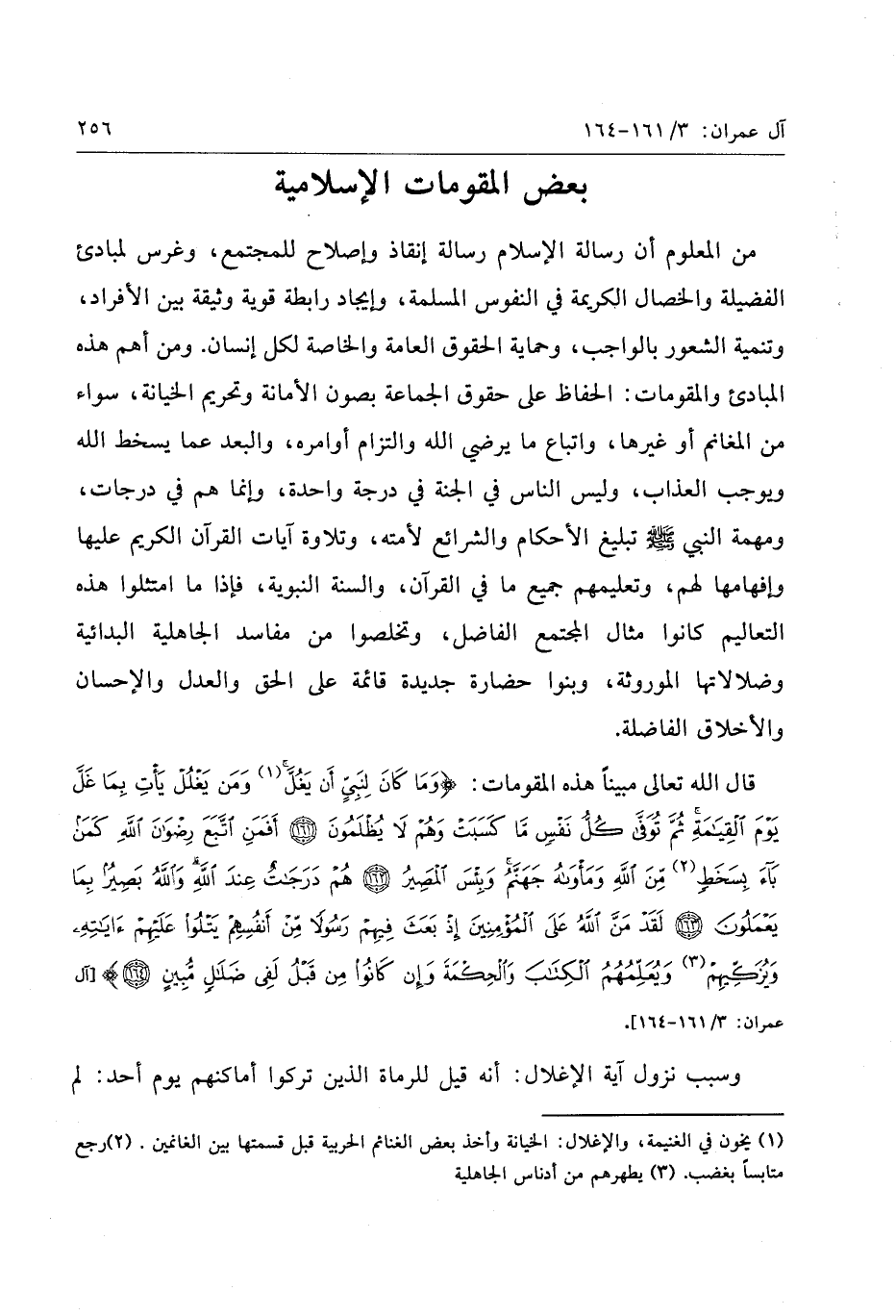 من المعلوم أن رسالة الإسلام رسالة إنقاذ وإصلاح للمجتمع، وغرس لمبادئ الفضيلة والخصال الكريمة في النفوس المسلمة، وإيجاد رابطة قوية ووثيقة بين الأفراد، وتنمية الشعور بالواجب، وحماية الحقوق العامة والخاصة لكل إنسان. ومن أهم هذه المبادئ والمقومات: الحفاظ على حقوق الجماعة بصون الأمانة وتحريم الخيانة، سواء من المغانم أو غيرها، واتباع ما يرضي الله والتزام أوامره، والبعد عما يسخط الله ويوجب العذاب، وليس الناس في الجنة في درجة واحدة، وإنما هم في درجات، ومهمة النبي صلّى الله عليه وسلّم تبليغ الأحكام والشرائع لأمته، وتلاوة آيات القرآن الكريم عليها وإفهامها لهم، وتعليمهم جميع ما في القرآن، والسنة النبوية، فإذا ما امتثلوا هذه التعاليم كانوا مثال المجتمع الفاضل، وتخلصوا من مفاسد الجاهلية البدائية وضلالاتها الموروثة، وبنوا حضارة جديدة قائمة على الحق والعدل والإحسان والأخلاق الفاضلة.