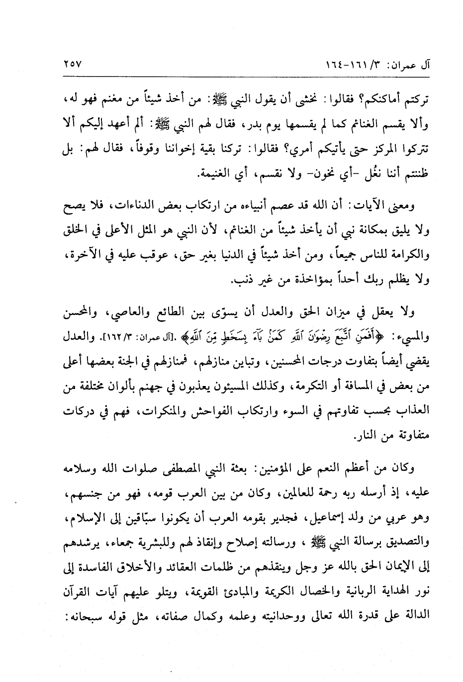 ومعنى الآيات: أن الله قد عصم أنبياءه من ارتكاب بعض الدناءات، فلا يصح ولا يليق بمكانة نبي أن يأخذ شيئا من الغنائم، لأن النبي هو المثل الأعلى في الخلق والكرامة للناس جميعا، ومن أخذ شيئا في الدنيا بغير حق، عوقب عليه في الآخرة، ولا يظلم ربك أحدا بمؤاخذة من غير ذنب.