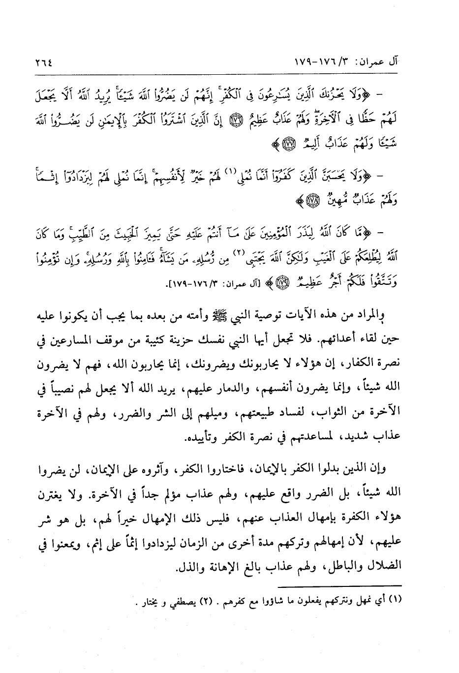 وَلا يَحْزُنْكَ الَّذِينَ يُسارِعُونَ فِي الْكُفْرِ إِنَّهُمْ لَنْ يَضُرُّوا اللَّهَ شَيْئاً يُرِيدُ اللَّهُ أَلاَّ يَجْعَلَ لَهُمْ حَظًّا فِي الْآخِرَةِ وَلَهُمْ عَذابٌ عَظِيمٌ (176) إِنَّ الَّذِينَ اشْتَرَوُا الْكُفْرَ بِالْإِيْمانِ لَنْ يَضُرُّوا اللَّهَ شَيْئاً وَلَهُمْ عَذابٌ أَلِيمٌ (177) وَلا يَحْسَبَنَّ الَّذِينَ كَفَرُوا أَنَّما نُمْلِي لَهُمْ خَيْرٌ لِأَنْفُسِهِمْ إِنَّما نُمْلِي لَهُمْ لِيَزْدادُوا إِثْماً وَلَهُمْ عَذابٌ مُهِينٌ (178) ما كانَ اللَّهُ لِيَذَرَ الْمُؤْمِنِينَ عَلى ما أَنْتُمْ عَلَيْهِ حَتَّى يَمِيزَ الْخَبِيثَ مِنَ الطَّيِّبِ وَما كانَ اللَّهُ لِيُطْلِعَكُمْ عَلَى الْغَيْبِ وَلكِنَّ اللَّهَ يَجْتَبِي مِنْ رُسُلِهِ مَنْ يَشاءُ فَآمِنُوا بِاللَّهِ وَرُسُلِهِ وَإِنْ تُؤْمِنُوا وَتَتَّقُوا فَلَكُمْ أَجْرٌ عَظِيمٌ (179)