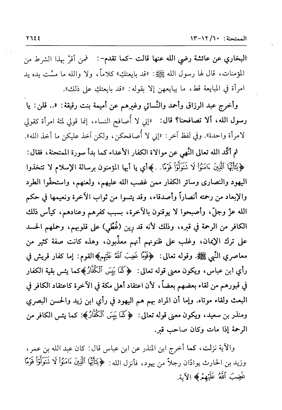 يا أَيُّهَا الَّذِينَ آمَنُوا لا تَتَوَلَّوْا قَوْماً.. أي يا أيها المؤمنون برسالة الإسلام لا تتخذوا اليهود والنصارى وسائر الكفار ممن غضب الله عليهم، ولعنهم، واستحقّوا الطرد والإبعاد من رحمته أنصارا وأصدقاء، وقد يئسوا من ثواب الآخرة ونعيمها في حكم الله عزّ وجلّ، وأصبحوا لا يوقنون بالآخرة، بسبب كفرهم وعنادهم، كيأس ذلك الكافر من الرحمة في قبره، وذلك لأنه قد رين (غطّي) على قلوبهم، وحملهم الحسد على ترك الإيمان، وغلب على ظنونهم أنهم معذّبون، وهذه كانت صفة كثير من معاصري النّبي صلّى الله عليه وسلّم. وقوله تعالى: قَوْماً غَضِبَ اللَّهُ عَلَيْهِمْ القوم: إما كفار قريش في رأي ابن عباس، ويكون معنى قوله تعالى: كَما يَئِسَ الْكُفَّارُ كما يئس بقية الكفار في قبورهم من لقاء بعضهم بعضا، لأن اعتقاد أهل مكة في الآخرة كاعتقاد الكافر في البعث ولقاء موتاه. وإما أن المراد بهم هم اليهود في رأي ابن زيد والحسن البصري ومنذر بن سعيد، ويكون معنى قوله تعالى: كَما يَئِسَ الْكُفَّارُ: كما يئس الكفار من الرحمة إذا مات وكان صاحب قبر.