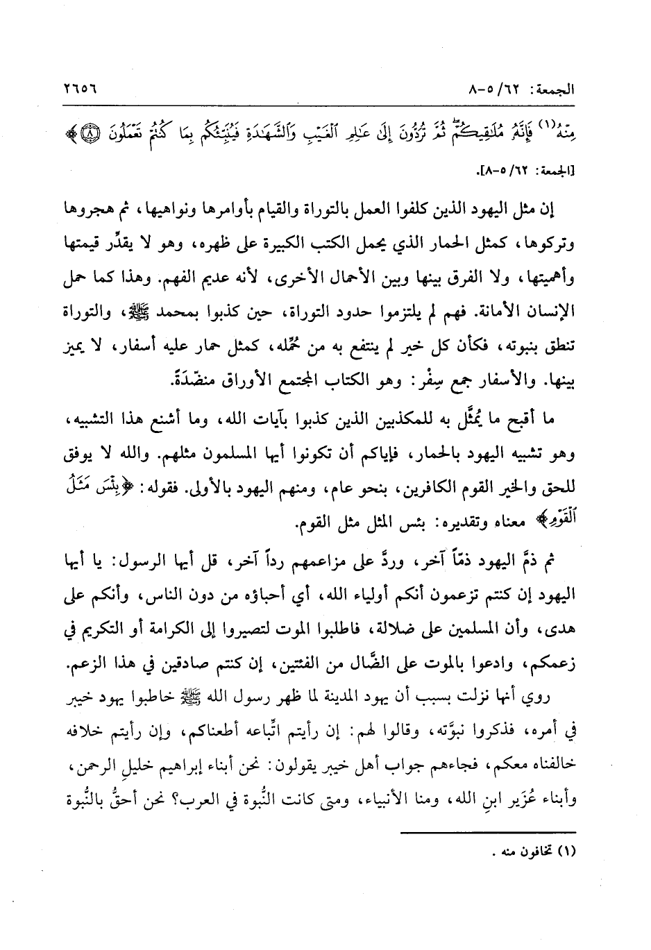 إن مثل اليهود الذين كلفوا العمل بالتوراة والقيام بأوامرها ونواهيها، ثم هجروها وتركوها، كمثل الحمار الذي يحمل الكتب الكبيرة على ظهره، وهو لا يقدّر قيمتها وأهميتها، ولا الفرق بينها وبين الأحمال الأخرى، لأنه عديم الفهم. وهذا كما حمل الإنسان الأمانة. فهم لم يلتزموا حدود التوراة، حين كذبوا بمحمد صلّى الله عليه وسلّم، والتوراة تنطق بنبوته، فكأن كل خير لم ينتفع به من حمّله، كمثل حمار عليه أسفار، لا يميز بينها. والأسفار جمع سفر: وهو الكتاب المجتمع الأوراق منضّدة.