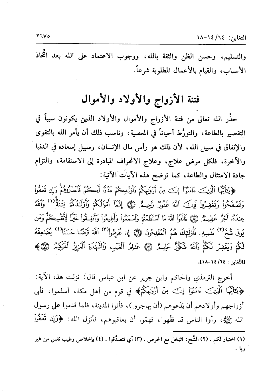 يا أَيُّهَا الَّذِينَ آمَنُوا إِنَّ مِنْ أَزْواجِكُمْ وَأَوْلادِكُمْ عَدُوًّا لَكُمْ فَاحْذَرُوهُمْ وَإِنْ تَعْفُوا وَتَصْفَحُوا وَتَغْفِرُوا فَإِنَّ اللَّهَ غَفُورٌ رَحِيمٌ (14) إِنَّما أَمْوالُكُمْ وَأَوْلادُكُمْ فِتْنَةٌ وَاللَّهُ عِنْدَهُ أَجْرٌ عَظِيمٌ (15) فَاتَّقُوا اللَّهَ مَا اسْتَطَعْتُمْ وَاسْمَعُوا وَأَطِيعُوا وَأَنْفِقُوا خَيْراً لِأَنْفُسِكُمْ وَمَنْ يُوقَ شُحَّ نَفْسِهِ فَأُولئِكَ هُمُ الْمُفْلِحُونَ (16) إِنْ تُقْرِضُوا اللَّهَ قَرْضاً حَسَناً يُضاعِفْهُ لَكُمْ وَيَغْفِرْ لَكُمْ وَاللَّهُ شَكُورٌ حَلِيمٌ (17) عالِمُ الْغَيْبِ وَالشَّهادَةِ الْعَزِيزُ الْحَكِيمُ (18)