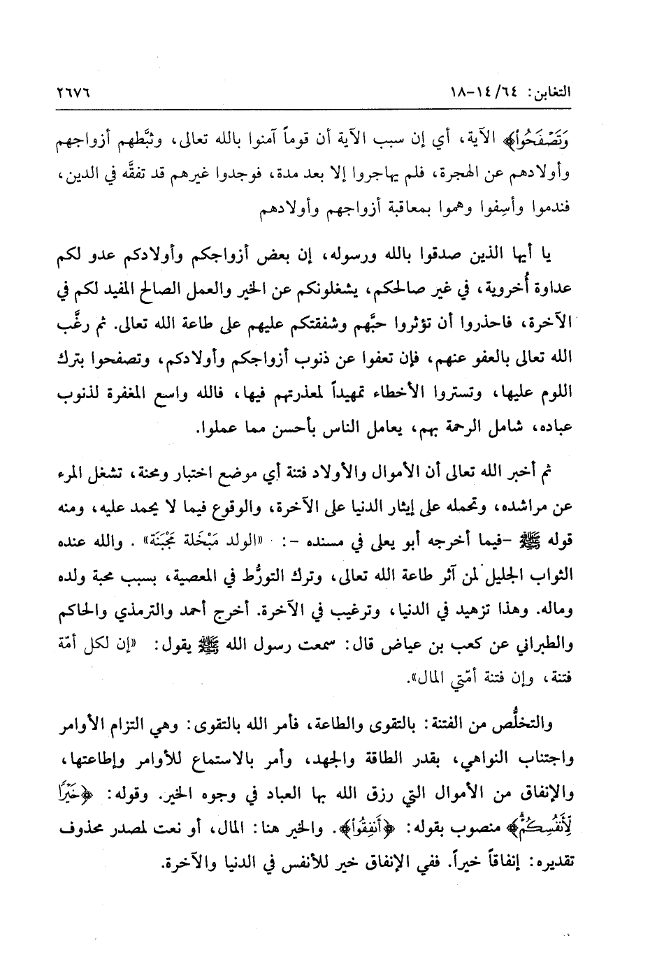 الآية، أي إن سبب الآية أن قوما آمنوا بالله تعالى، وثبّطهم أزواجهم وأولادهم عن الهجرة، فلم يهاجروا إلا بعد مدة، فوجدوا غيرهم قد تفقّه في الدين، فندموا وأسفوا وهموا بمعاقبة أزواجهم وأولادهم يا أيها الذين صدقوا بالله ورسوله، إن بعض أزواجكم وأولادكم عدو لكم عداوة أخروية، في غير صالحكم، يشغلونكم عن الخير والعمل الصالح المفيد لكم في الآخرة، فاحذروا أن تؤثروا حبّهم وشفقتكم عليهم على طاعة الله تعالى. ثم رغّب الله تعالى بالعفو عنهم، فإن تعفوا عن ذنوب أزواجكم وأولادكم، وتصفحوا بترك اللوم عليها، وتستروا الأخطاء تمهيدا لمعذرتهم فيها، فالله واسع المغفرة لذنوب عباده، شامل الرحمة بهم، يعامل الناس بأحسن مما عملوا.
