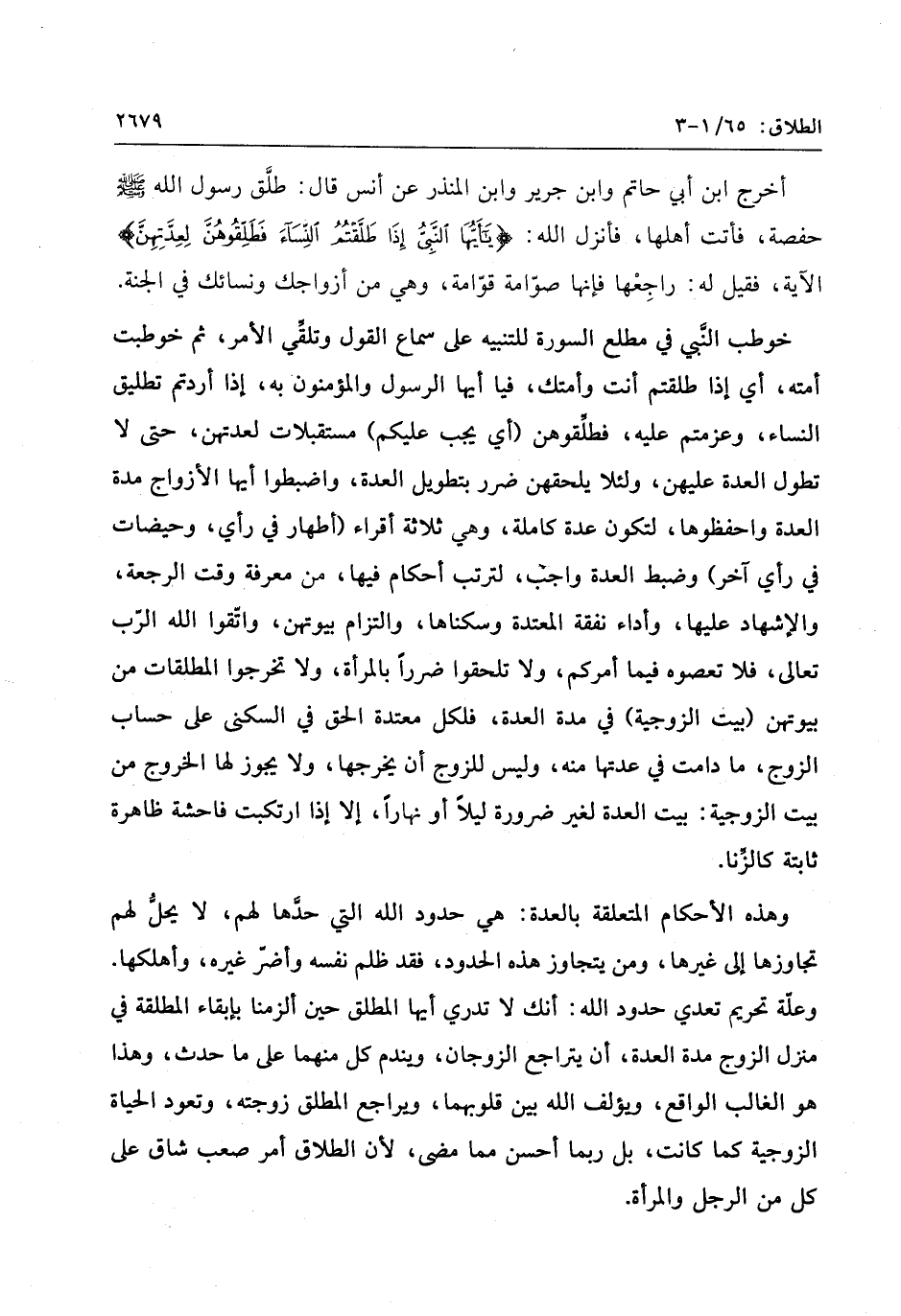 خوطب النّبي في مطلع السورة للتنبيه على سماع القول وتلقّي الأمر، ثم خوطبت أمته، أي إذا طلقتم أنت وأمتك، فيا أيها الرسول والمؤمنون به، إذا أردتم تطليق النساء، وعزمتم عليه، فطلّقوهن (أي يجب عليكم) مستقبلات لعدتهن، حتى لا تطول العدة عليهن، ولئلا يلحقهن ضرر بتطويل العدة، واضبطوا أيها الأزواج مدة العدة واحفظوها، لتكون عدة كاملة، وهي ثلاثة أقراء (أطهار في رأي، وحيضات في رأي آخر) وضبط العدة واجب، لترتب أحكام فيها، من معرفة وقت الرجعة، والإشهاد عليها، وأداء نفقة المعتدة وسكناها، والتزام بيوتهن، واتّقوا الله الرّب تعالى، فلا تعصوه فيما أمركم، ولا تلحقوا ضررا بالمرأة، ولا تخرجوا المطلقات من بيوتهن (بيت الزوجية) في مدة العدة، فلكل معتدة الحق في السكنى على حساب الزوج، ما دامت في عدتها منه، وليس للزوج أن يخرجها، ولا يجوز لها الخروج من بيت الزوجية: بيت العدة لغير ضرورة ليلا أو نهارا، إلا إذا ارتكبت فاحشة ظاهرة ثابتة كالزّنا.