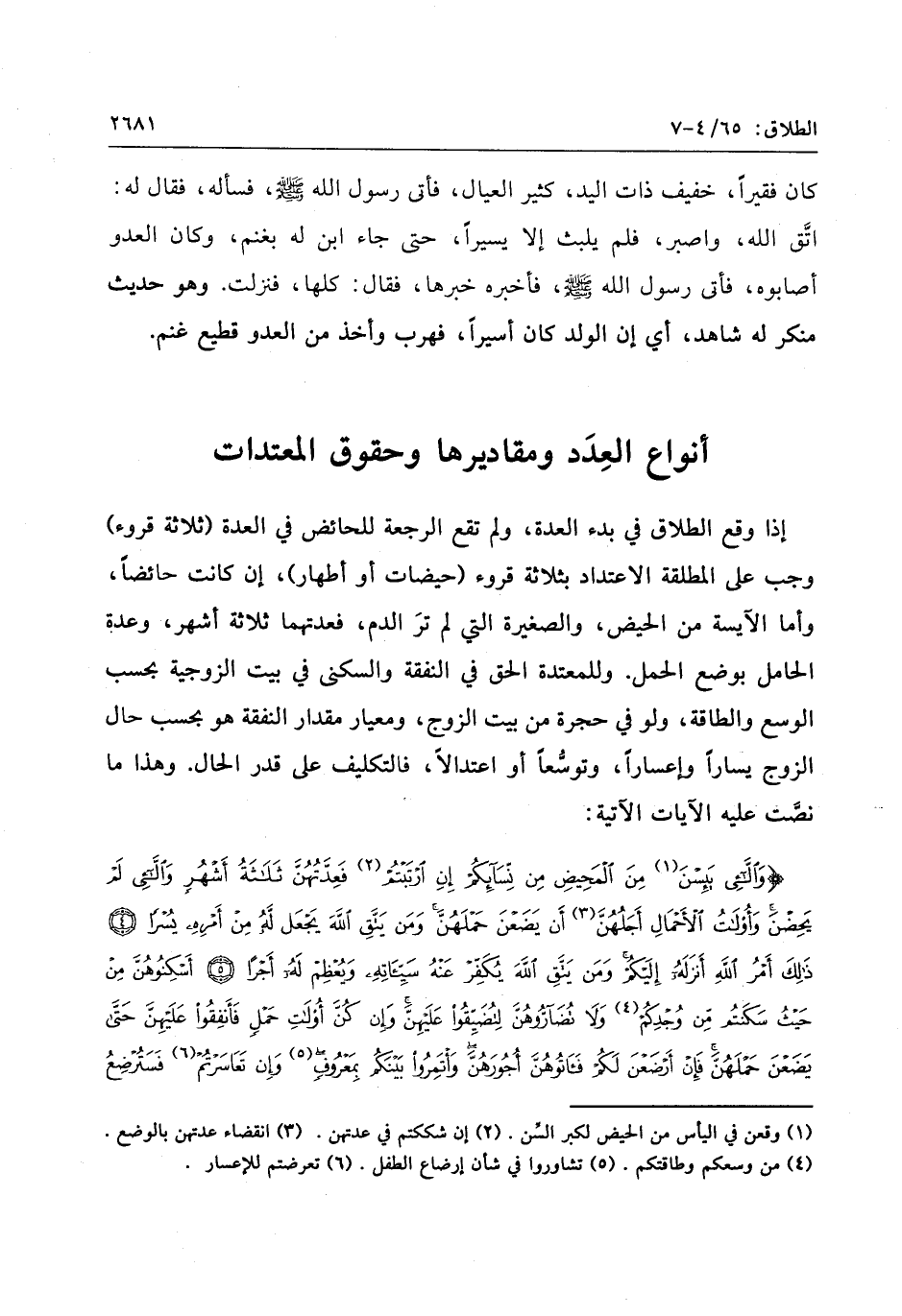 وَاللاَّئِي يَئِسْنَ مِنَ الْمَحِيضِ مِنْ نِسائِكُمْ إِنِ ارْتَبْتُمْ فَعِدَّتُهُنَّ ثَلاثَةُ أَشْهُرٍ وَاللاَّئِي لَمْ يَحِضْنَ وَأُولاتُ الْأَحْمالِ أَجَلُهُنَّ أَنْ يَضَعْنَ حَمْلَهُنَّ وَمَنْ يَتَّقِ اللَّهَ يَجْعَلْ لَهُ مِنْ أَمْرِهِ يُسْراً (4) ذلِكَ أَمْرُ اللَّهِ أَنْزَلَهُ إِلَيْكُمْ وَمَنْ يَتَّقِ اللَّهَ يُكَفِّرْ عَنْهُ سَيِّئاتِهِ وَيُعْظِمْ لَهُ أَجْراً (5) أَسْكِنُوهُنَّ مِنْ حَيْثُ سَكَنْتُمْ مِنْ وُجْدِكُمْ وَلا تُضآرُّوهُنَّ لِتُضَيِّقُوا عَلَيْهِنَّ وَإِنْ كُنَّ أُولاتِ حَمْلٍ فَأَنْفِقُوا عَلَيْهِنَّ حَتَّى يَضَعْنَ حَمْلَهُنَّ فَإِنْ أَرْضَعْنَ لَكُمْ فَآتُوهُنَّ أُجُورَهُنَّ وَأْتَمِرُوا بَيْنَكُمْ بِمَعْرُوفٍ وَإِنْ تَعاسَرْتُمْ فَسَتُرْضِعُ لَهُ أُخْرى (6) لِيُنْفِقْ ذُو سَعَةٍ مِنْ سَعَتِهِ وَمَنْ قُدِرَ عَلَيْهِ رِزْقُهُ فَلْيُنْفِقْ مِمَّا آتاهُ اللَّهُ لا يُكَلِّفُ اللَّهُ نَفْساً إِلاَّ ما آتاها سَيَجْعَلُ اللَّهُ بَعْدَ عُسْرٍ يُسْراً (7)