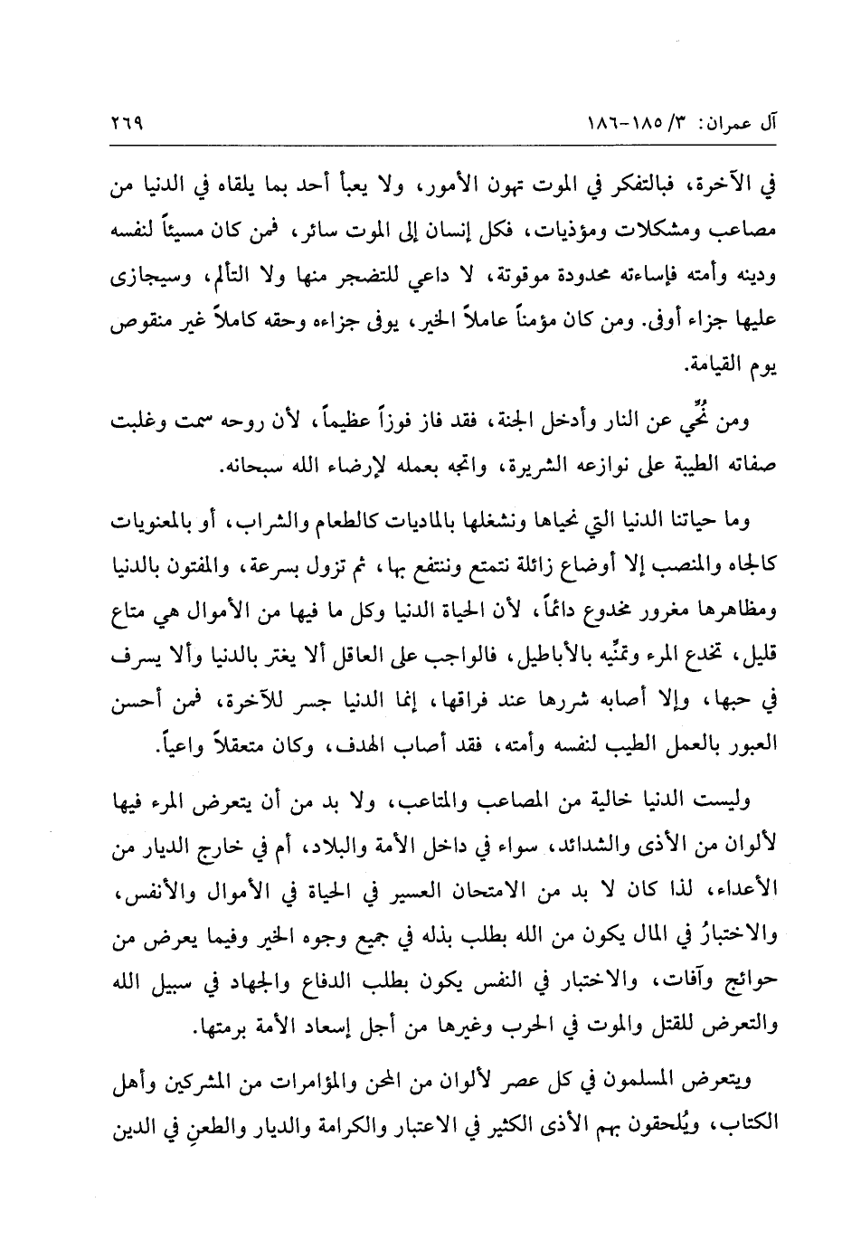 في الآخرة، فبالتفكر في الموت تهون الأمور، ولا يعبأ أحد بما يلقاه في الدنيا من مصاعب ومشكلات ومؤذيات، فكل إنسان إلى الموت سائر، فمن كان مسيئا لنفسه ودينه وأمته فإساءته محدودة موقوتة، لا داعي للتضجر منها ولا التألم، وسيجازى عليها جزاء أوفى. ومن كان مؤمنا عاملا الخير، يوفى جزاءه وحقه كاملا غير منقوص يوم القيامة.