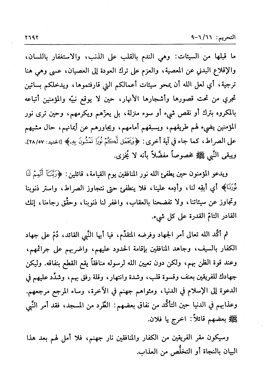 ويدعو المؤمنون حين يطفئ الله نور المنافقين يوم القيامة، قائلين: رَبَّنا أَتْمِمْ لَنا نُورَنا أي أبقه لنا، وأدمه علينا، فلا ينطفئ حتى نتجاوز الصراط، واستر ذنوبنا وتجاوز عن سيئاتنا، ولا تفضحنا بالعقاب، واغفر لنا ذنوبنا، وحقّق رجاءنا، إنك القادر التامّ القدرة على كل شيء.