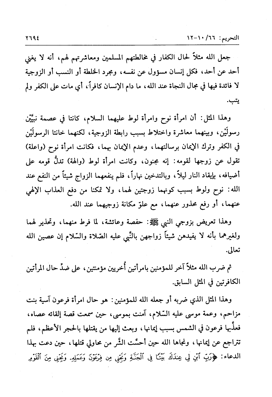 وهذا المثل: أن امرأة نوح وامرأة لوط عليهما السّلام، كانتا في عصمة نبيّين رسولين، وبينهما معاشرة واختلاط بسبب رابطة الزوجية، لكنهما خانتا الرسولين في الكفر وترك الإيمان برسالتهما، وعدم الإيمان بهما، فكانت امرأة نوح (واعلة) تقول عن زوجها لقومه: إنه مجنون، وكانت امرأة لوط (والهة) تدلّ قومه على أضيافه، بإيقاد النار ليلا، وبالتدخين نهارا، فلم ينفعهما الزواج شيئا من النفع عند الله: نوح ولوط بسبب كونهما زوجتين لهما، ولا تمكنا من دفع العذاب الإلهي عنهما، أو رفع محذور عنهما، مع علوّ مكانة زوجيهما عند الله.