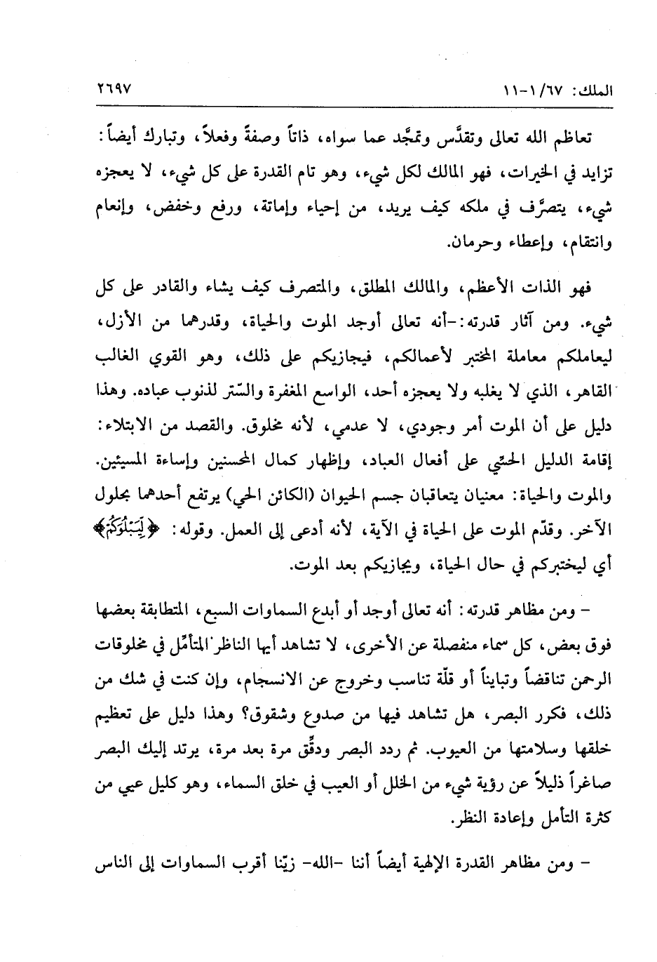 فهو الذات الأعظم، والمالك المطلق، والمتصرف كيف يشاء والقادر على كل شيء. ومن آثار قدرته:- أنه تعالى أوجد الموت والحياة، وقدرهما من الأزل، ليعاملكم معاملة المختبر لأعمالكم، فيجازيكم على ذلك، وهو القوي الغالب القاهر، الذي لا يغلبه ولا يعجزه أحد، الواسع المغفرة والسّتر لذنوب عباده. وهذا دليل على أن الموت أمر وجودي، لا عدمي، لأنه مخلوق. والقصد من الابتلاء:
