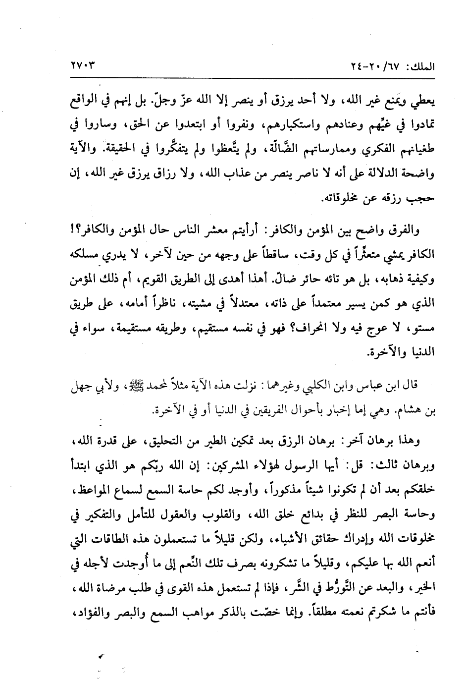 وهذا برهان آخر: برهان الرزق بعد تمكين الطير من التحليق، على قدرة الله، وبرهان ثالث: قل: أيها الرسول لهؤلاء المشركين: إن الله ربّكم هو الذي ابتدأ خلقكم بعد أن لم تكونوا شيئا مذكورا، وأوجد لكم حاسة السمع لسماع المواعظ، وحاسة البصر للنظر في بدائع خلق الله، والقلوب والعقول للتأمل والتفكير في مخلوقات الله وإدراك حقائق الأشياء، ولكن قليلا ما تستعملون هذه الطاقات التي أنعم الله بها عليكم، وقليلا ما تشكرونه بصرف تلك النّعم إلى ما أوجدت لأجله في الخير، والبعد عن التّورّط في الشرّ، فإذا لم تستعمل هذه القوى في طلب مرضاة الله، فأنتم ما شكرتم نعمته مطلقا. وإنما خصّت بالذكر مواهب السمع والبصر والفؤاد،