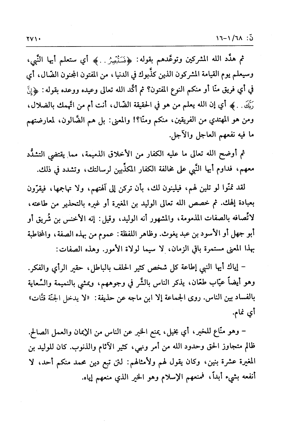 لقد تمنّوا لو تلين لهم، فيلينون لك، بأن تركن إلى آلهتهم، ولا تهاجمها، فيقرّون بعبادة إلهك. ثم خصص الله تعالى الوليد بن المغيرة أو غيره بالتحذير من طاعته، لاتّصافه بالصفات المذمومة، والمشهور أنه الوليد، وقيل: إنه الأخنس بن شريق أو أبو جهل أو الأسود بن عبد يغوث. وظاهر اللفظة: عموم من بهذه الصفة، والمخاطبة بهذا المعنى مستمرة باقي الزمان، لا سيما لولاة الأمور. وهذه الصفات: