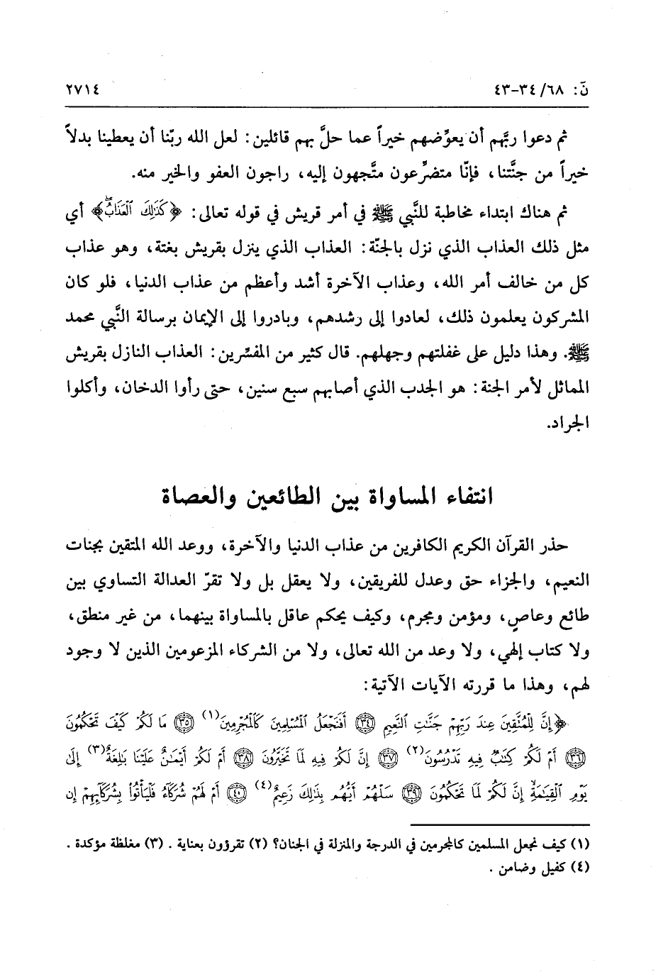 إِنَّ لِلْمُتَّقِينَ عِنْدَ رَبِّهِمْ جَنَّاتِ النَّعِيمِ (34) أَفَنَجْعَلُ الْمُسْلِمِينَ كَالْمُجْرِمِينَ (35) ما لَكُمْ كَيْفَ تَحْكُمُونَ (36) أَمْ لَكُمْ كِتابٌ فِيهِ تَدْرُسُونَ (37) إِنَّ لَكُمْ فِيهِ لَما تَخَيَّرُونَ (38)