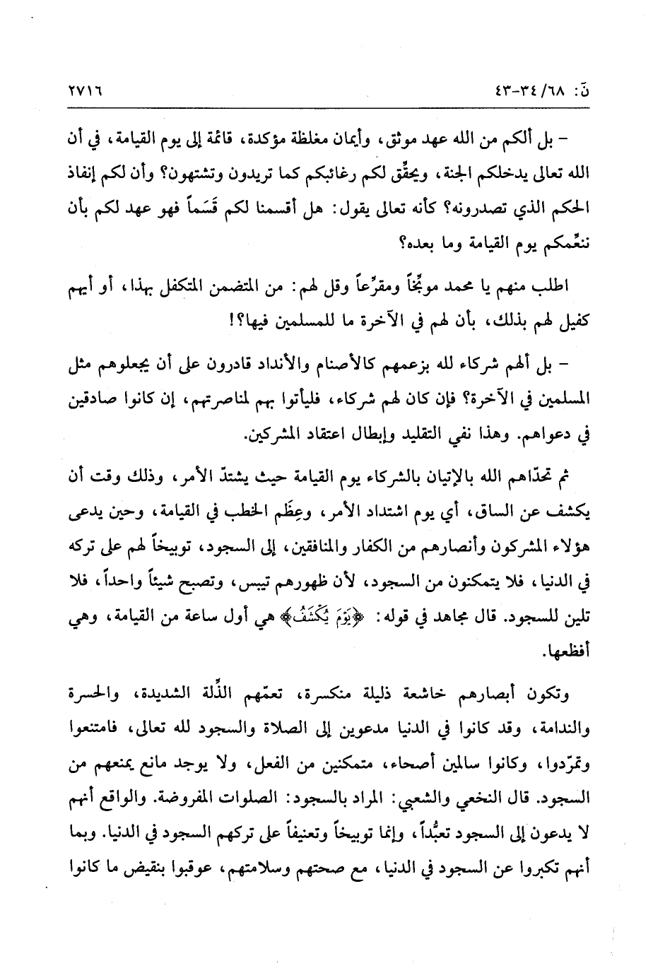 ثم تحدّاهم الله بالإتيان بالشركاء يوم القيامة حيث يشتدّ الأمر، وذلك وقت أن يكشف عن الساق، أي يوم اشتداد الأمر، وعظم الخطب في القيامة، وحين يدعى هؤلاء المشركون وأنصارهم من الكفار والمنافقين، إلى السجود، توبيخا لهم على تركه في الدنيا، فلا يتمكنون من السجود، لأن ظهورهم تيبس، وتصبح شيئا واحدا، فلا تلين للسجود. قال مجاهد في قوله: يَوْمَ يُكْشَفُ هي أول ساعة من القيامة، وهي أفظعها.