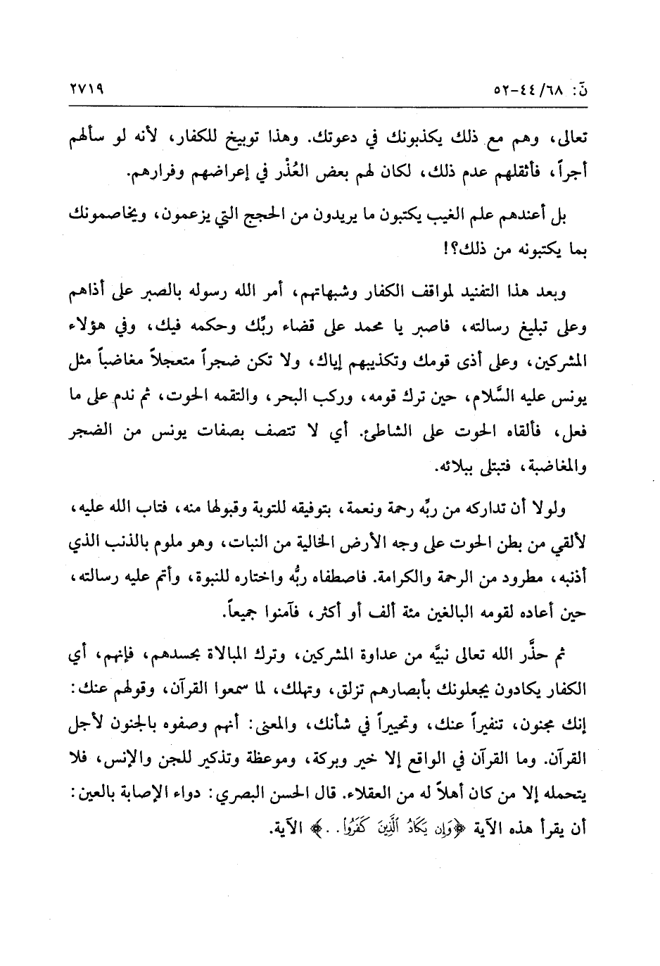 بل أعندهم علم الغيب يكتبون ما يريدون من الحجج التي يزعمون، ويخاصمونك بما يكتبونه من ذلك؟! وبعد هذا التفنيد لمواقف الكفار وشبهاتهم، أمر الله رسوله بالصبر على أذاهم وعلى تبليغ رسالته، فاصبر يا محمد على قضاء ربّك وحكمه فيك، وفي هؤلاء المشركين، وعلى أذى قومك وتكذيبهم إياك، ولا تكن ضجرا متعجلا مغاضبا مثل يونس عليه السّلام، حين ترك قومه، وركب البحر، والتقمه الحوت، ثم ندم على ما فعل، فألقاه الحوت على الشاطئ. أي لا تتصف بصفات يونس من الضجر والمغاضبة، فتبتلى ببلائه.