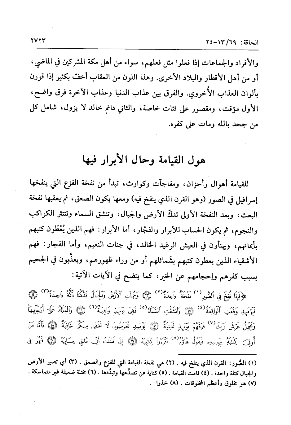 فَإِذا نُفِخَ فِي الصُّورِ نَفْخَةٌ واحِدَةٌ (13) وَحُمِلَتِ الْأَرْضُ وَالْجِبالُ فَدُكَّتا دَكَّةً واحِدَةً (14) فَيَوْمَئِذٍ وَقَعَتِ الْواقِعَةُ (15) وَانْشَقَّتِ السَّماءُ فَهِيَ يَوْمَئِذٍ واهِيَةٌ (16) وَالْمَلَكُ عَلى أَرْجائِها وَيَحْمِلُ عَرْشَ رَبِّكَ فَوْقَهُمْ يَوْمَئِذٍ ثَمانِيَةٌ (17)