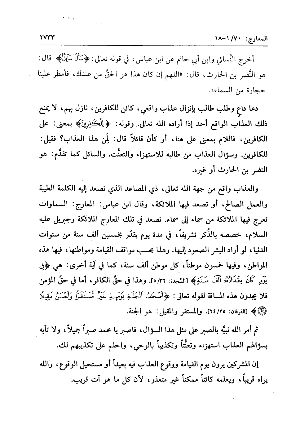أخرج النّسائي وابن أبي حاتم عن ابن عباس، في قوله تعالى: سَأَلَ سائِلٌ قال: