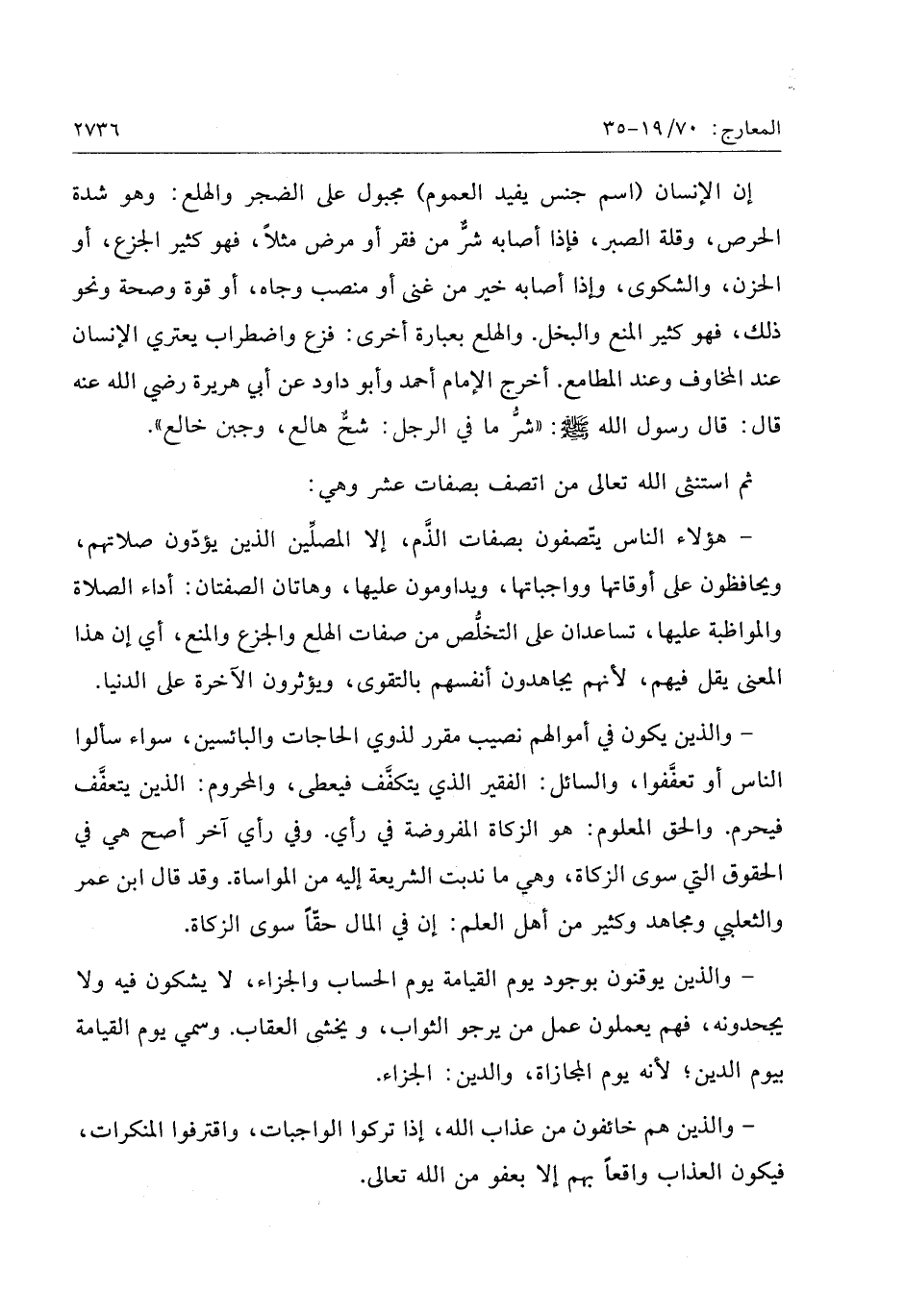 - والذين يكون في أموالهم نصيب مقرر لذوي الحاجات والبائسين، سواء سألوا الناس أو تعفّفوا، والسائل: الفقير الذي يتكفّف فيعطى، والمحروم: الذين يتعفّف فيحرم. والحق المعلوم: هو الزكاة المفروضة في رأي. وفي رأي آخر أصح هي في الحقوق التي سوى الزكاة، وهي ما ندبت الشريعة إليه من المواساة. وقد قال ابن عمر والثعلبي ومجاهد وكثير من أهل العلم: إن في المال حقّا سوى الزكاة.