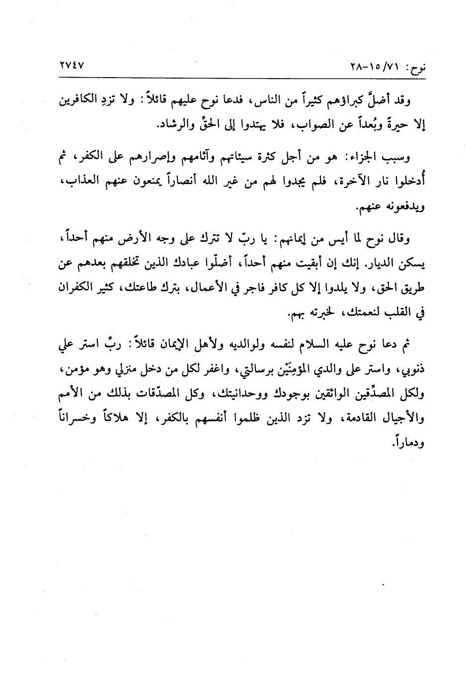 ثم دعا نوح عليه السّلام لنفسه ولوالديه ولأهل الإيمان قائلا: ربّ استر علي ذنوبي، واستر على والدي المؤمنين برسالتي، واغفر لكل من دخل منزلي وهو مؤمن، ولكل المصدّقين الواثقين بوجودك ووحدانيتك، وكل المصدّقات بذلك من الأمم والأجيال القادمة، ولا تزد الذين ظلموا أنفسهم بالكفر، إلا هلاكا وخسرانا ودمارا.