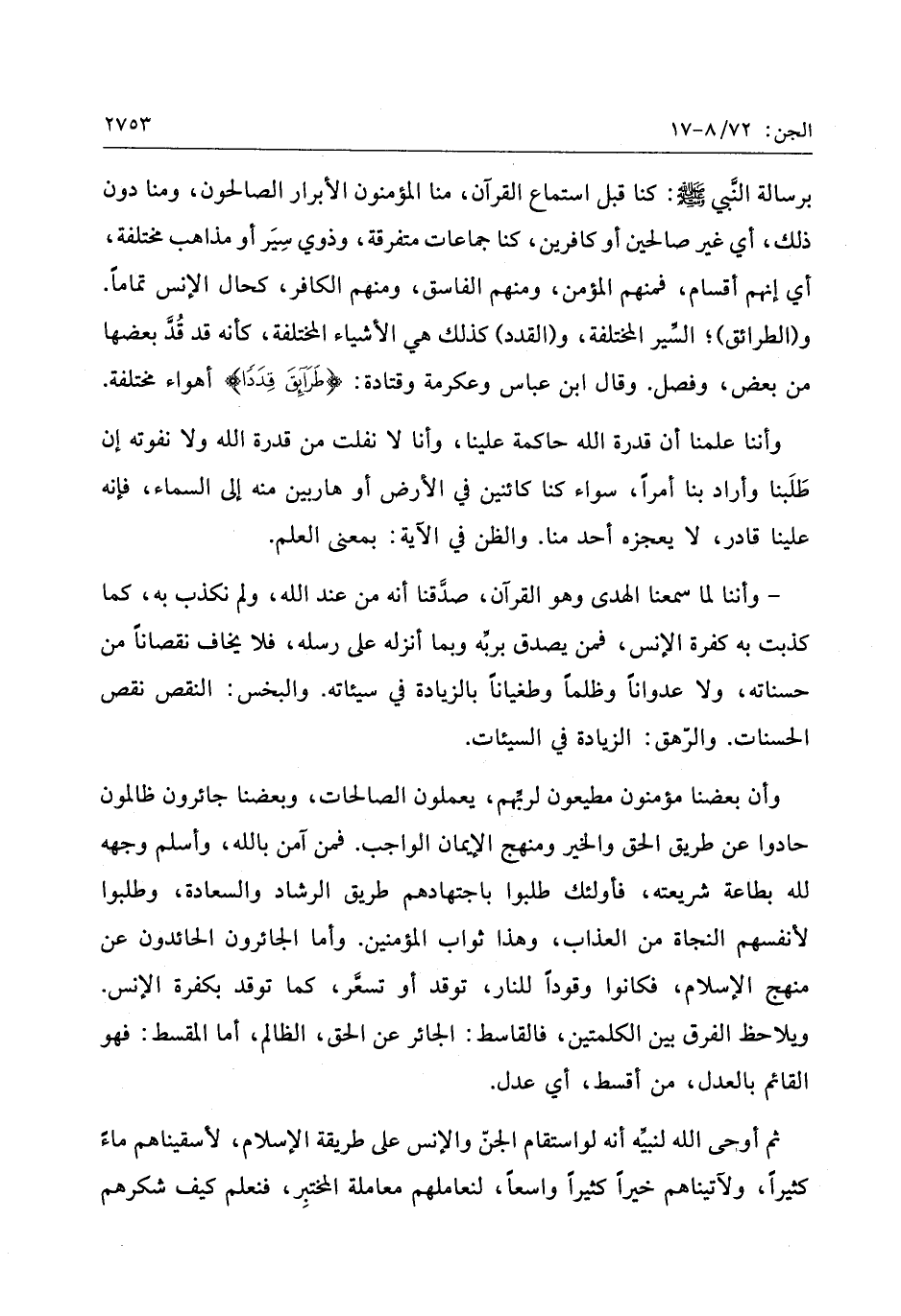 وأن بعضنا مؤمنون مطيعون لربّهم، يعملون الصالحات، وبعضنا جائرون ظالمون حادوا عن طريق الحق والخير ومنهج الإيمان الواجب. فمن آمن بالله، وأسلم وجهه لله بطاعة شريعته، فأولئك طلبوا باجتهادهم طريق الرشاد والسعادة، وطلبوا لأنفسهم النجاة من العذاب، وهذا ثواب المؤمنين. وأما الجائرون الحائدون عن منهج الإسلام، فكانوا وقودا للنار، توقد أو تسعّر، كما توقد بكفرة الإنس.