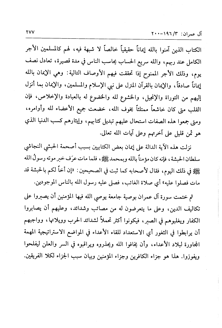 الكتاب الذين آمنوا بالله إيمانا حقيقيا خالصا لا شبهة فيه، لهم كالمسلمين الأجر الكامل عند ربهم، والله سريع الحساب يحاسب الناس في مدة قصيرة، تعادل نصف يوم، وذلك الأجر الممنوح إذا تحققت فيهم الأوصاف التالية: وهي الإيمان بالله إيمانا صادقا، والإيمان بالقرآن المنزل على نبي الإسلام والمسلمين، والإيمان بما أنزل إليهم من التوراة والإنجيل، والخشوع لله والخضوع له بالعبادة والإخلاص، فإن القلب متى كان خاشعا ممتلئا بخوف الله، خضعت جميع الأعضاء لله وأوامره، ومتى جمعوا هذه الصفات استحال عليهم تبديل كتابهم، وإيثارهم كسب الدنيا الذي هو ثمن قليل على آخرتهم وعلى آيات الله تعالى.