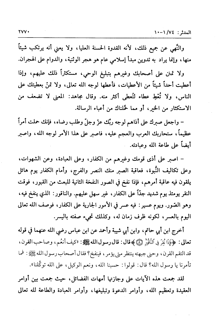 - اصبر على أذى قومك وغيرهم من الكفار، وعلى العبادة، وعن الشهوات، وعلى تكاليف النّبوة، فعاقبة الصبر منك النصر والفرج، وأمام الكفار يوم هائل يلقون فيه عاقبة أمرهم، فإذا نفخ في الصور النفخة الثانية للبعث من القبور، فوقت النقر يومئذ يوم شديد جدّا على الكفار، غير سهل عليهم. والناقور: الذي ينفخ فيه، وهو الصّور. ويوم عسير: فيه عسر في الأمور الجارية على الكفار، فوصف الله تعالى اليوم بالعسر، لكونه ظرف زمان له، وكذلك تجيء صفته باليسر.