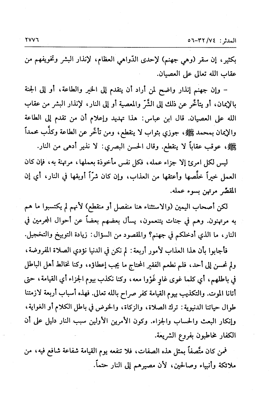 بكثير، إن سقر (وهي جهنم) لإحدى الدّواهي العظام، لإنذار البشر وتخويفهم من عقاب الله تعالى على العصيان.
