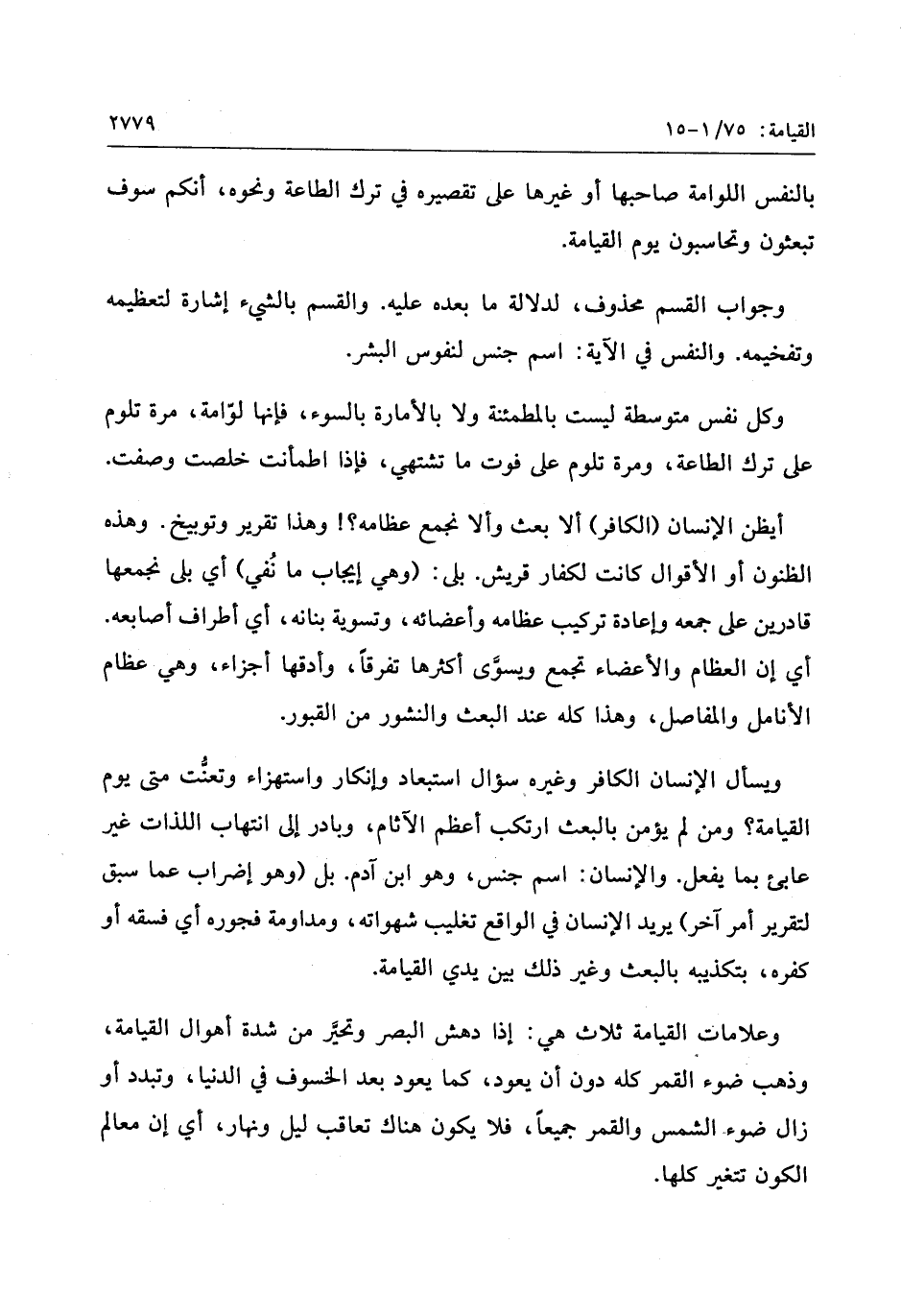 وعلامات القيامة ثلاث هي: إذا دهش البصر وتحيّر من شدة أهوال القيامة، وذهب ضوء القمر كله دون أن يعود، كما يعود بعد الخسوف في الدنيا، وتبدد أو زال ضوء الشمس والقمر جميعا، فلا يكون هناك تعاقب ليل ونهار، أي إن معالم الكون تتغير كلها.