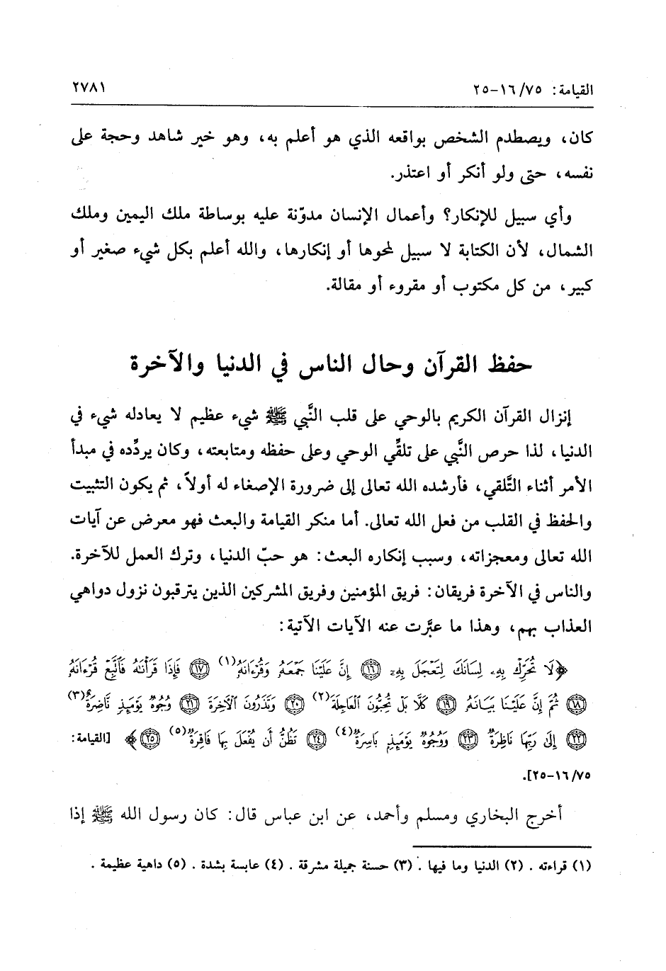 إنزال القرآن الكريم بالوحي على قلب النّبي صلّى الله عليه وسلّم شيء عظيم لا يعادله شيء في الدنيا، لذا حرص النّبي على تلقّي الوحي وعلى حفظه ومتابعته، وكان يردّده في مبدأ الأمر أثناء التّلقي، فأرشده الله تعالى إلى ضرورة الإصغاء له أولا، ثم يكون التثبيت والحفظ في القلب من فعل الله تعالى. أما منكر القيامة والبعث فهو معرض عن آيات الله تعالى ومعجزاته، وسبب إنكاره البعث: هو حبّ الدنيا، وترك العمل للآخرة.