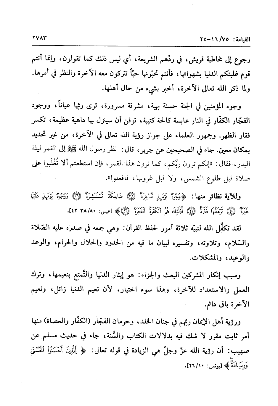وجوه المؤمنين في الجنة حسنة بهية، مشرقة مسرورة، ترى ربّها عيانا، ووجود الفجّار الكفّار في النار عابسة كالحة كئيبة، توقن أن سينزل بها داهية عظيمة، تكسر فقار الظهر. وجمهور العلماء على جواز رؤية الله تعالى في الآخرة، من غير تحديد بمكان معين.