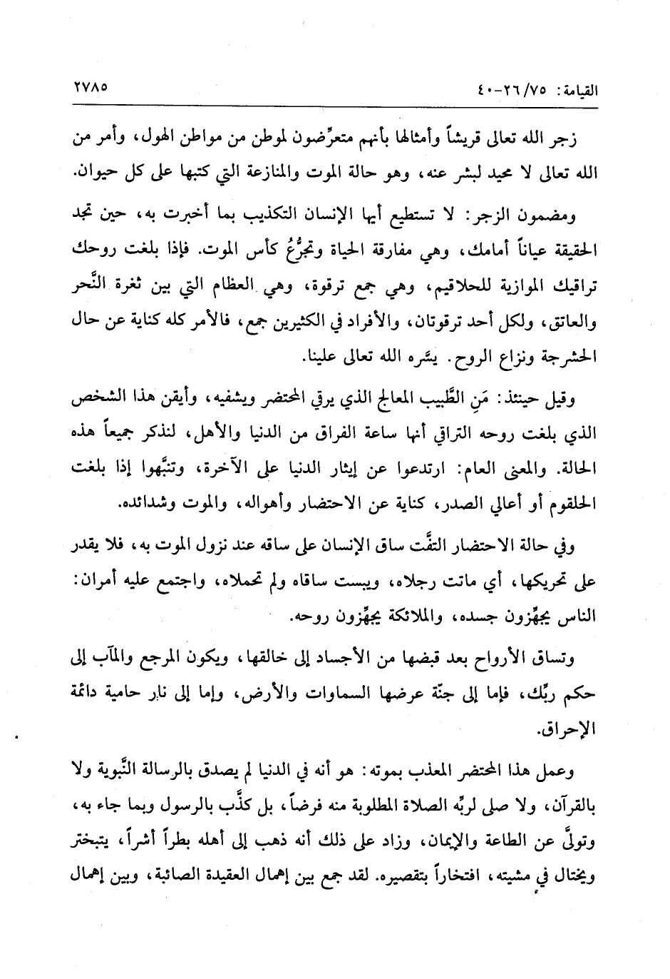 ومضمون الزجر: لا تستطيع أيها الإنسان التكذيب بما أخبرت به، حين تجد الحقيقة عيانا أمامك، وهي مفارقة الحياة وتجرّع كأس الموت. فإذا بلغت روحك تراقيك الموازية للحلاقيم، وهي جمع ترقوة، وهي العظام التي بين ثغرة النّحر والعاتق، ولكل أحد ترقوتان، والأفراد في الكثيرين جمع، فالأمر كله كناية عن حال الحشرجة ونزاع الروح. يسّره الله تعالى علينا.