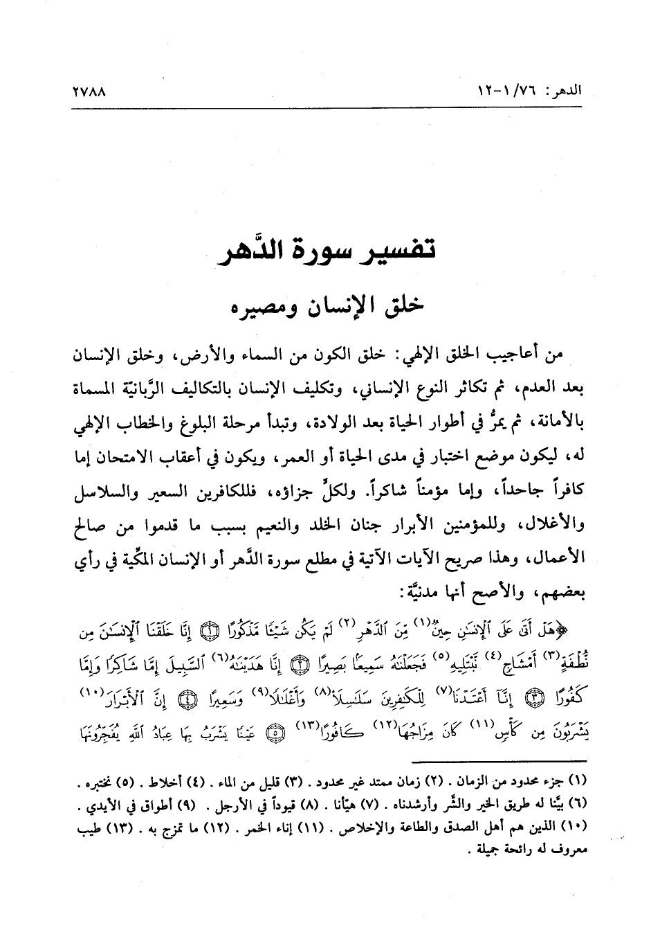 هَلْ أَتى عَلَى الْإِنْسانِ حِينٌ مِنَ الدَّهْرِ لَمْ يَكُنْ شَيْئاً مَذْكُوراً (1) إِنَّا خَلَقْنَا الْإِنْسانَ مِنْ نُطْفَةٍ أَمْشاجٍ نَبْتَلِيهِ فَجَعَلْناهُ سَمِيعاً بَصِيراً (2) إِنَّا هَدَيْناهُ السَّبِيلَ إِمَّا شاكِراً وَإِمَّا كَفُوراً (3) إِنَّا أَعْتَدْنا لِلْكافِرِينَ سَلاسِلَ وَأَغْلالاً وَسَعِيراً (4)
