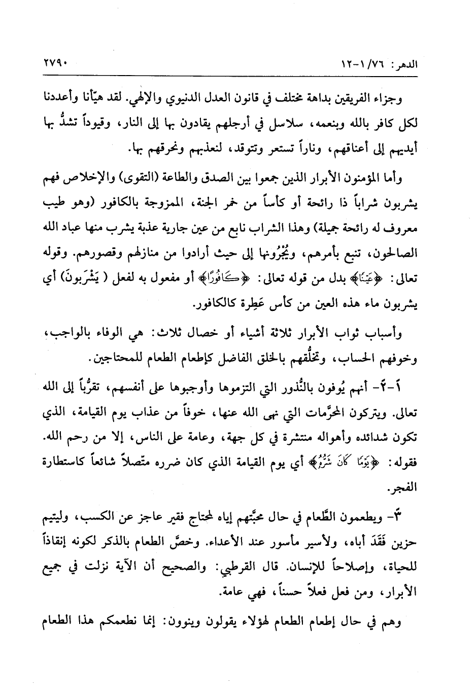 1- 2- أنهم يوفون بالنّذور التي التزموها وأوجبوها على أنفسهم، تقرّبا إلى الله تعالى. ويتركون المحرّمات التي نهى الله عنها، خوفا من عذاب يوم القيامة، الذي تكون شدائده وأهواله منتشرة في كل جهة، وعامة على الناس، إلا من رحم الله.