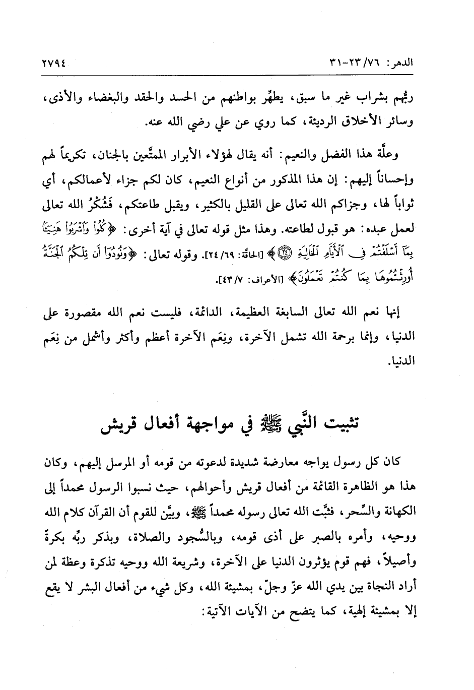 كان كل رسول يواجه معارضة شديدة لدعوته من قومه أو المرسل إليهم، وكان هذا هو الظاهرة القائمة من أفعال قريش وأحوالهم، حيث نسبوا الرسول محمدا إلى الكهانة والسّحر، فثبّت الله تعالى رسوله محمدا صلّى الله عليه وسلّم، وبيّن للقوم أن القرآن كلام الله ووحيه، وأمره بالصبر على أذى قومه، وبالسّجود والصلاة، وبذكر ربّه بكرة وأصيلا، فهم قوم يؤثرون الدنيا على الآخرة، وشريعة الله ووحيه تذكرة وعظة لمن أراد النجاة بين يدي الله عزّ وجلّ، بمشيئة الله، وكل شيء من أفعال البشر لا يقع إلا بمشيئة إلهية، كما يتضح من الآيات الآتية: