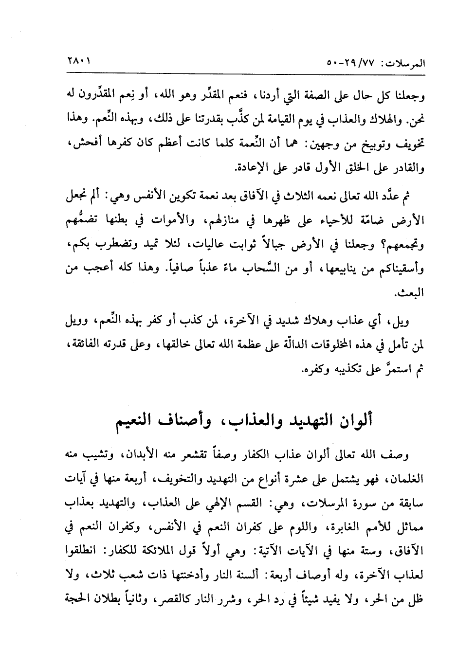 وصف الله تعالى ألوان عذاب الكفار وصفا تقشعر منه الأبدان، وتشيب منه الغلمان، فهو يشتمل على عشرة أنواع من التهديد والتخويف، أربعة منها في آيات سابقة من سورة المرسلات، وهي: القسم الإلهي على العذاب، والتهديد بعذاب مماثل للأمم الغابرة، واللوم على كفران النعم في الأنفس، وكفران النعم في الآفاق، وستة منها في الآيات الآتية: وهي أولا قول الملائكة للكفار: انطلقوا لعذاب الآخرة، وله أوصاف أربعة: ألسنة النار وأدخنتها ذات شعب ثلاث، ولا ظل من الحر، ولا يفيد شيئا في رد الحر، وشرر النار كالقصر، وثانيا بطلان الحجة