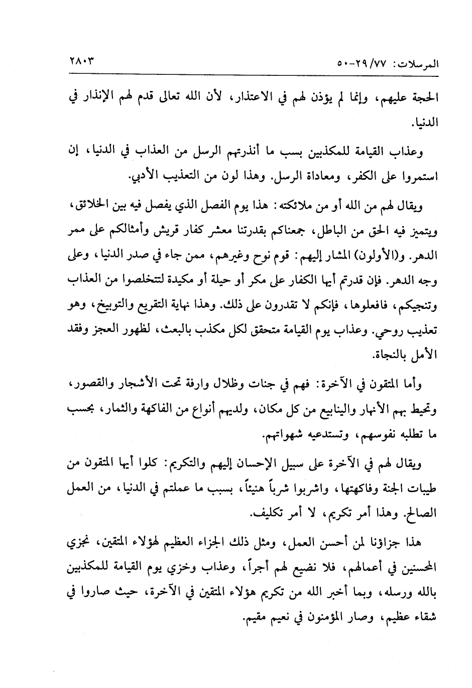 وأما المتقون في الآخرة: فهم في جنات وظلال وارفة تحت الأشجار والقصور، وتحيط بهم الأنهار والينابيع من كل مكان، ولديهم أنواع من الفاكهة والثمار، بحسب ما تطلبه نفوسهم، وتستدعيه شهواتهم.