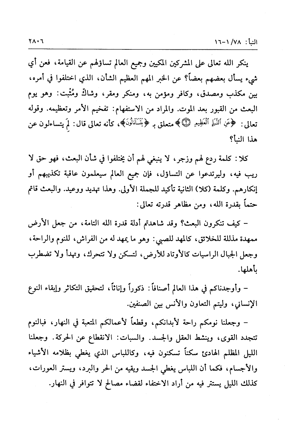 ينكر الله تعالى على المشركين المكيين وجميع العالم تساؤلهم عن القيامة، فعن أي شيء يسأل بعضهم بعضا؟ عن الخبر المهم العظيم الشأن، الذي اختلفوا في أمره، بين مكذب ومصدق، وكافر ومؤمن به، ومنكر ومقر، وشاكّ ومثبت: وهو يوم البعث من القبور بعد الموت. والمراد من الاستفهام: تفخيم الأمر وتعظيمه. وقوله تعالى: عَنِ النَّبَإِ الْعَظِيمِ (2) متعلق ب يَتَساءَلُونَ، كأنه تعالى قال: لم يتساءلون عن هذا النبأ؟