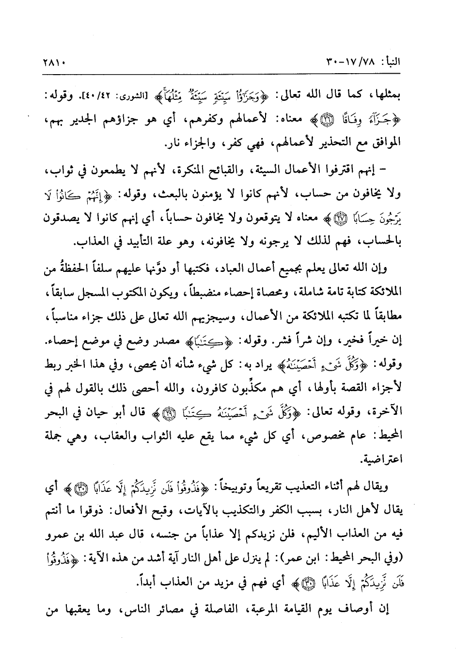 - إنهم اقترفوا الأعمال السيئة، والقبائح المنكرة، لأنهم لا يطمعون في ثواب، ولا يخافون من حساب، لأنهم كانوا لا يؤمنون بالبعث، وقوله: إِنَّهُمْ كانُوا لا يَرْجُونَ حِساباً (27) معناه لا يتوقعون ولا يخافون حسابا، أي إنهم كانوا لا يصدقون بالحساب، فهم لذلك لا يرجونه ولا يخافونه، وهو علة التأبيد في العذاب.