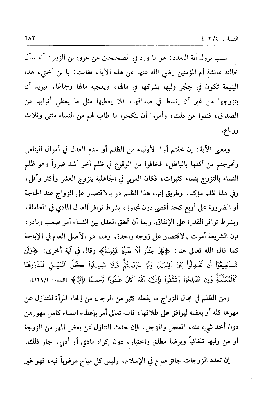 ومعنى الآية: إن خفتم أيها الأولياء من الظلم أو عدم العدل في أموال اليتامى وتحرجتم من أكلها بالباطل، فخافوا من الوقوع في ظلم آخر أشد ضررا وهو ظلم النساء بالتزوج بنساء كثيرات، فكان العربي في الجاهلية يتزوج العشر وأكثر وأقل، وفي هذا ظلم مؤكد، وطريق إنهاء هذا الظلم هو بالاقتصار على الزواج عند الحاجة أو الضرورة على أربع كحد أقصى دون تجاوز، بشرط توافر العدل المادي في المعاملة، وبشرط توافر القدرة على الإنفاق. وبما أن تحقق العدل بين النساء أمر صعب ونادر، فإن الشريعة أمرت بالاقتصار على زوجة واحدة، وهذا هو الأصل العام في الإباحة كما قال الله تعالى هنا: فَإِنْ خِفْتُمْ أَلَّا تَعْدِلُوا فَواحِدَةً وقال في آية أخرى: وَلَنْ تَسْتَطِيعُوا أَنْ تَعْدِلُوا بَيْنَ النِّساءِ وَلَوْ حَرَصْتُمْ فَلا تَمِيلُوا كُلَّ الْمَيْلِ فَتَذَرُوها كَالْمُعَلَّقَةِ وَإِنْ تُصْلِحُوا وَتَتَّقُوا فَإِنَّ اللَّهَ كانَ غَفُوراً رَحِيماً (129) [النساء: 4/ 129] .