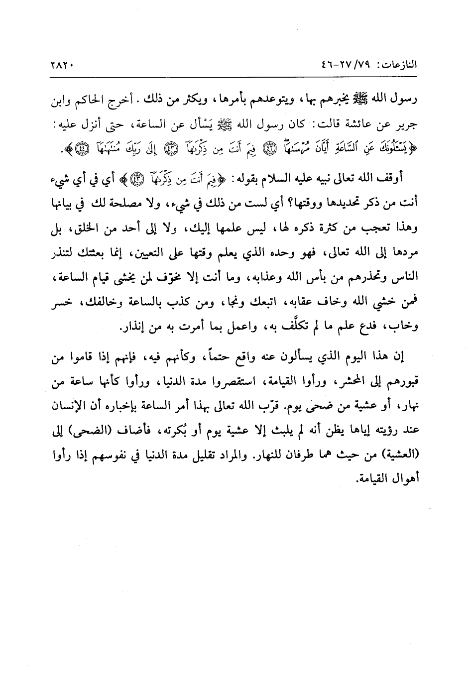 إن هذا اليوم الذي يسألون عنه واقع حتما، وكأنهم فيه، فإنهم إذا قاموا من قبورهم إلى المحشر، ورأوا القيامة، استقصروا مدة الدنيا، ورأوا كأنها ساعة من نهار، أو عشية من ضحى يوم. قرّب الله تعالى بهذا أمر الساعة بإخباره أن الإنسان عند رؤيته إياها يظن أنه لم يلبث إلا عشية يوم أو بكرته، فأضاف (الضحى) إلى (العشية) من حيث هما طرفان للنهار. والمراد تقليل مدة الدنيا في نفوسهم إذا رأوا أهوال القيامة.