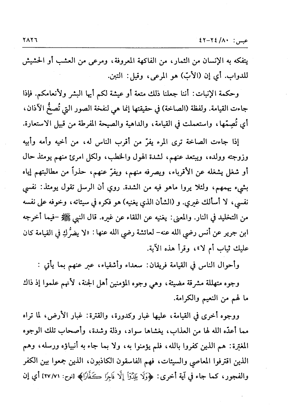 وحكمة الإنبات: أننا جعلنا ذلك متعة أو عيشة لكم أيها البشر ولأنعامكم. فإذا جاءت القيامة. ولفظة (الصاخة) في حقيقتها إنما هي لنفخة الصور التي تصخّ الآذان، أي تصمّها، واستعملت في القيامة، والداهية والصيحة المفرطة من قبيل الاستعارة.