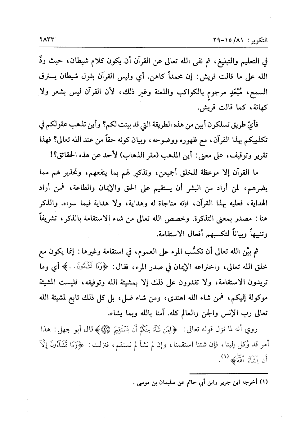في التعليم والتبليغ، ثم نفى الله تعالى عن القرآن أن يكون كلام شيطان، حيث ردّ الله على ما قالت قريش: إن محمدا كاهن. أي وليس القرآن بقول شيطان يسترق السمع، مبعد مرجوم بالكواكب واللعنة وغير ذلك، لأن القرآن ليس بشعر ولا كهانة، كما قالت قريش.
