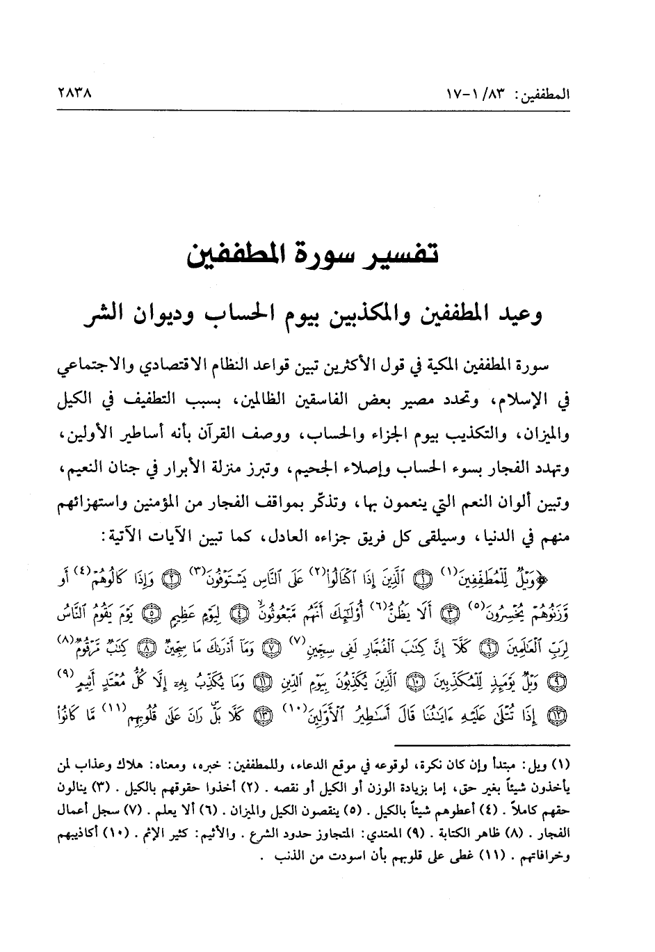 سورة المطففين المكية في قول الأكثرين تبين قواعد النظام الاقتصادي والاجتماعي في الإسلام، وتحدد مصير بعض الفاسقين الظالمين، بسبب التطفيف في الكيل والميزان، والتكذيب بيوم الجزاء والحساب، ووصف القرآن بأنه أساطير الأولين، وتهدد الفجار بسوء الحساب وإصلاء الجحيم، وتبرز منزلة الأبرار في جنان النعيم، وتبين ألوان النعم التي ينعمون بها، وتذكّر بمواقف الفجار من المؤمنين واستهزائهم منهم في الدنيا، وسيلقى كل فريق جزاءه العادل، كما تبين الآيات الآتية: