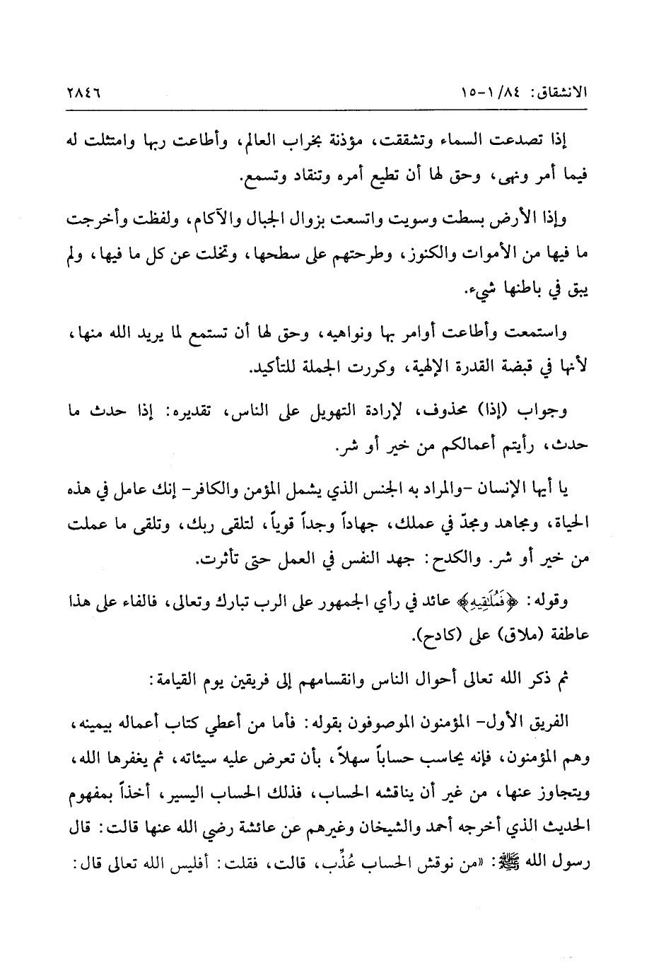 الفريق الأول- المؤمنون الموصوفون بقوله: فأما من أعطي كتاب أعماله بيمينه، وهم المؤمنون، فإنه يحاسب حسابا سهلا، بأن تعرض عليه سيئاته، ثم يغفرها الله، ويتجاوز عنها، من غير أن يناقشه الحساب، فذلك الحساب اليسير، أخذا بمفهوم الحديث الذي