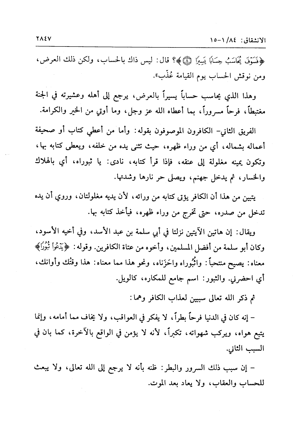 الفريق الثاني- الكافرون الموصوفون بقوله: وأما من أعطي كتاب أو صحيفة أعماله بشماله، أي من وراء ظهره، حيث تثنى يديه من خلفه، ويعطى كتابه بها، وتكون يمينه مغلولة إلى عنقه، فإذا قرأ كتابه، نادى: يا ثبوراه، أي بالهلاك والخسار، ثم يدخل جهنم، ويصلى حر نارها وشدتها.