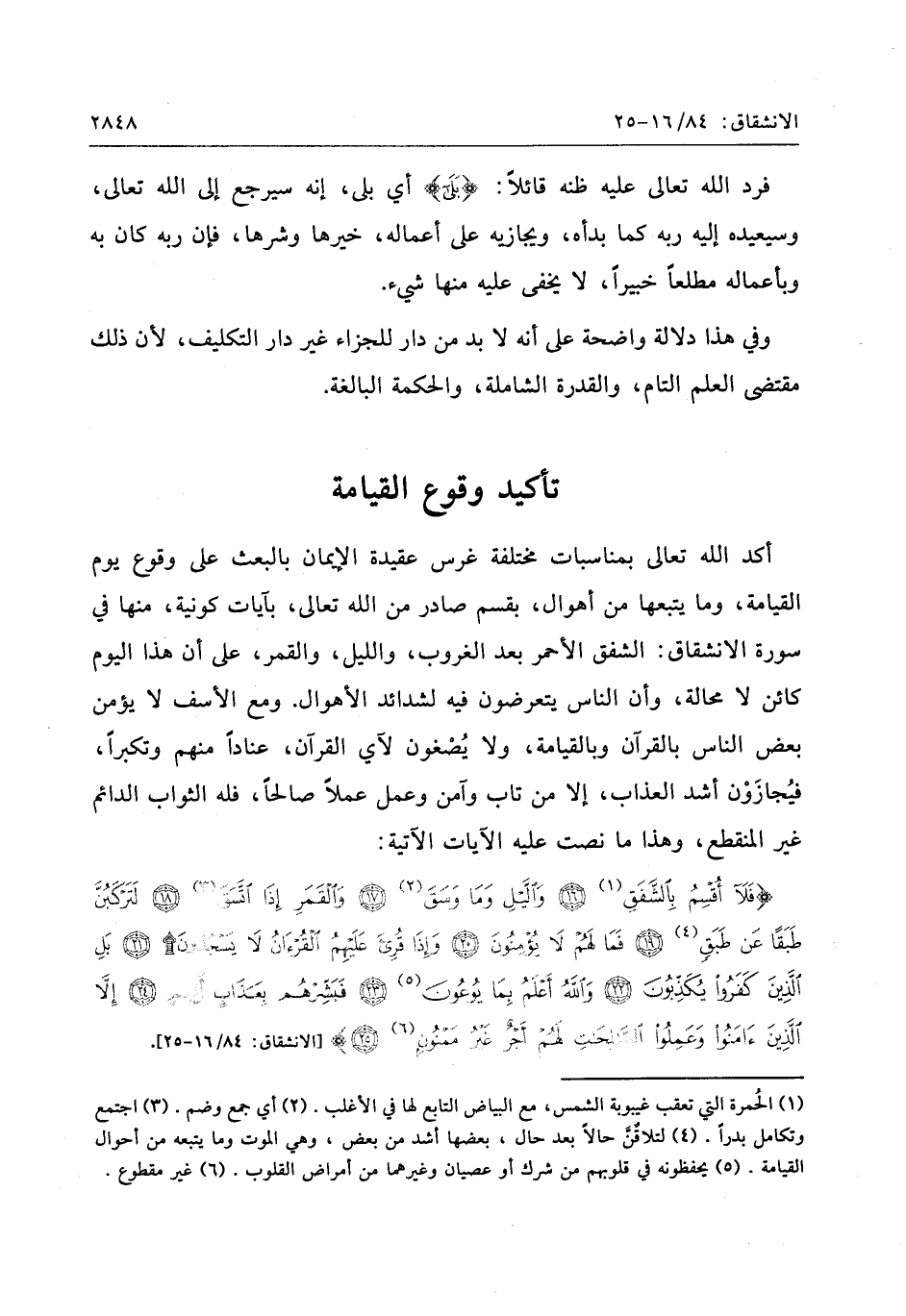 أكد الله تعالى بمناسبات مختلفة غرس عقيدة الإيمان بالبعث على وقوع يوم القيامة، وما يتبعها من أهوال، بقسم صادر من الله تعالى، بآيات كونية، منها في سورة الانشقاق: الشفق الأحمر بعد الغروب، والليل، والقمر، على أن هذا اليوم كائن لا محالة، وأن الناس يتعرضون فيه لشدائد الأهوال. ومع الأسف لا يؤمن بعض الناس بالقرآن وبالقيامة، ولا يصغون لآي القرآن، عنادا منهم وتكبرا، فيجازون أشد العذاب، إلا من تاب وآمن وعمل عملا صالحا، فله الثواب الدائم غير المنقطع، وهذا ما نصت عليه الآيات الآتية:
