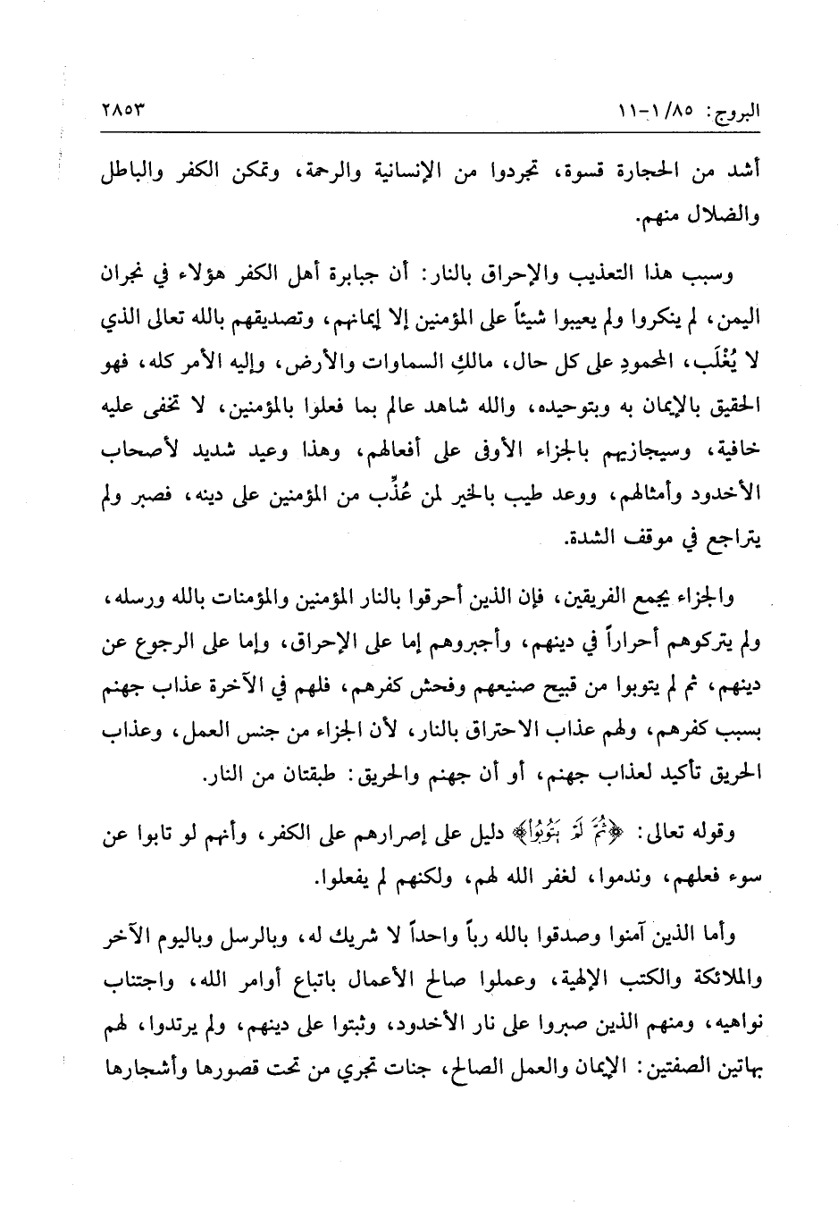 والجزاء يجمع الفريقين، فإن الذين أحرقوا بالنار المؤمنين والمؤمنات بالله ورسله، ولم يتركوهم أحرارا في دينهم، وأجبروهم إما على الإحراق، وإما على الرجوع عن دينهم، ثم لم يتوبوا من قبيح صنيعهم وفحش كفرهم، فلهم في الآخرة عذاب جهنم بسبب كفرهم، ولهم عذاب الاحتراق بالنار، لأن الجزاء من جنس العمل، وعذاب الحريق تأكيد لعذاب جهنم، أو أن جهنم والحريق: طبقتان من النار.